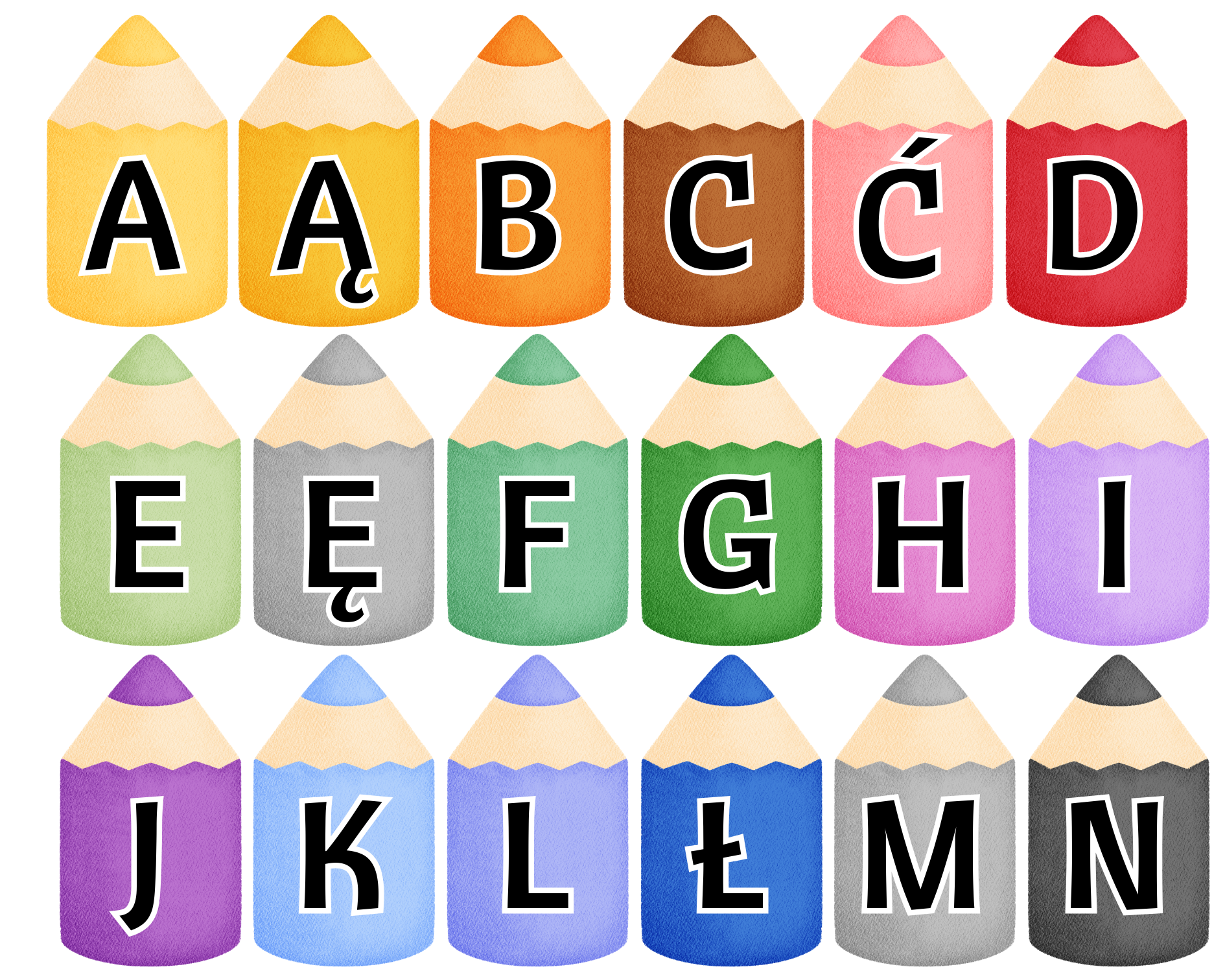 ALFABET - KOLOROWE KREDKI Każda litera na osobnej stronie A4. WYSOKOŚC KREDEK 25CM PLIK 32 STRONY do samodzielnego wydruku. Zestaw zawiera wszystkie 32 litery polskiego alfabetu.