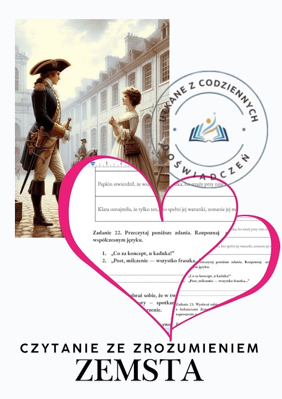 W tym tygodniu zaprosiłam moich uczniów do świata Fredrowskiej komedii — pełnego przesady, teatralnych gestów i językowych perełek. Fragment „Zemsty”, w którym Klara stawia Papkinowi trzy próby miłości, okazał się nie tylko źródłem śmiechu, ale też doskonałym materiałem do ćwiczeń z czytania ze zrozumieniem.
