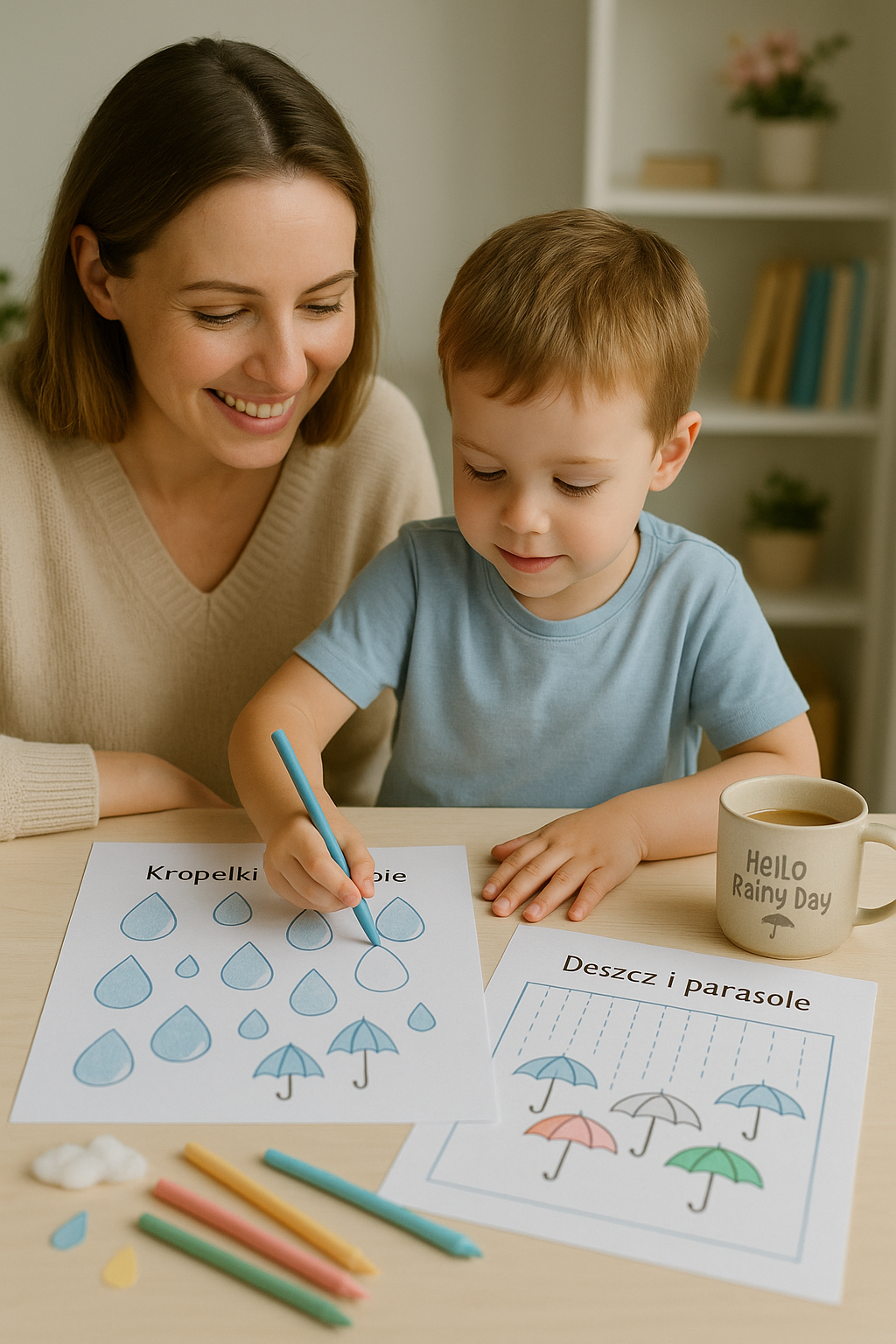 🌸 Po zakończeniu pracy porozmawiaj z dzieckiem: „Kiedy widzimy krople deszczu? Co robimy, gdy pada?”