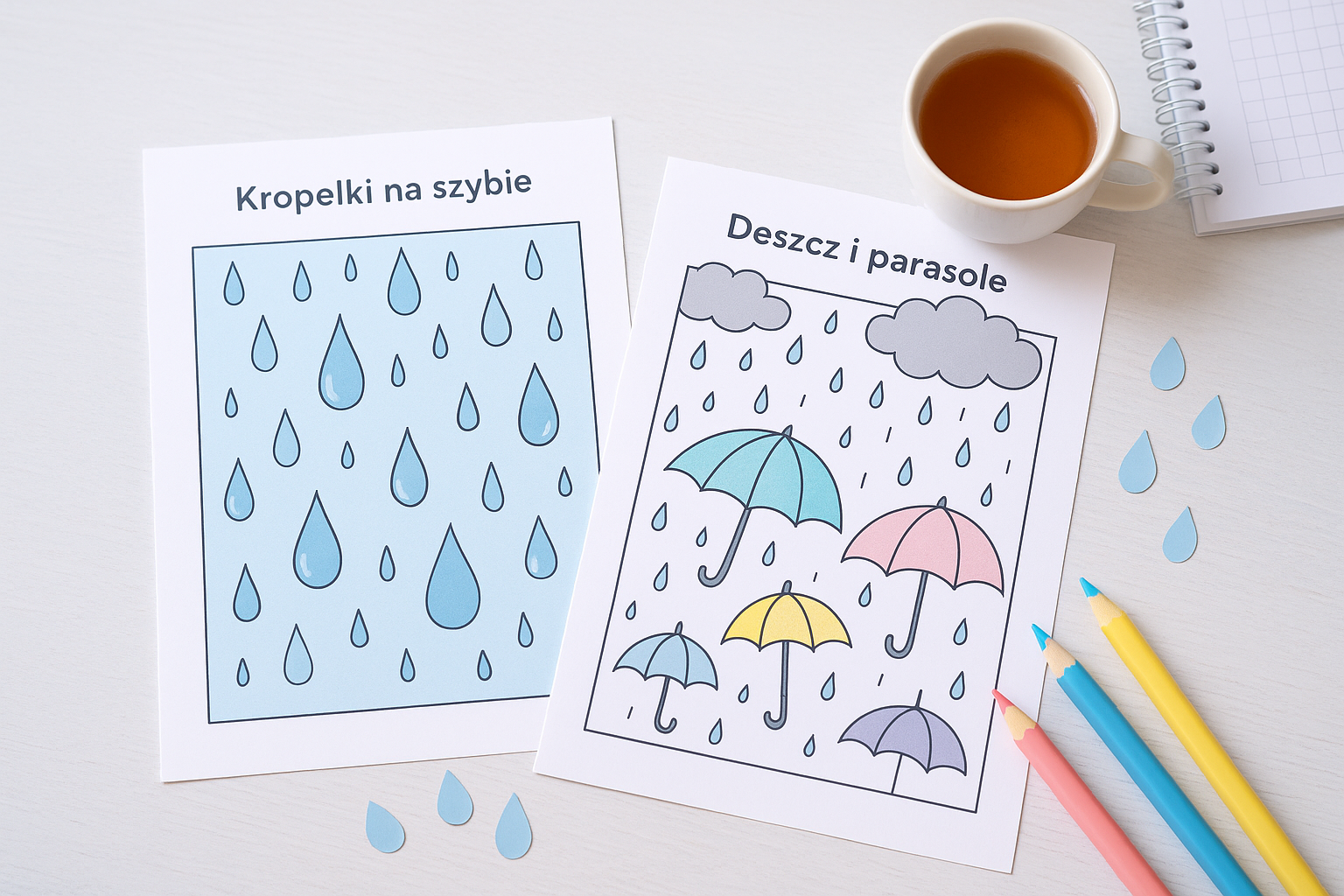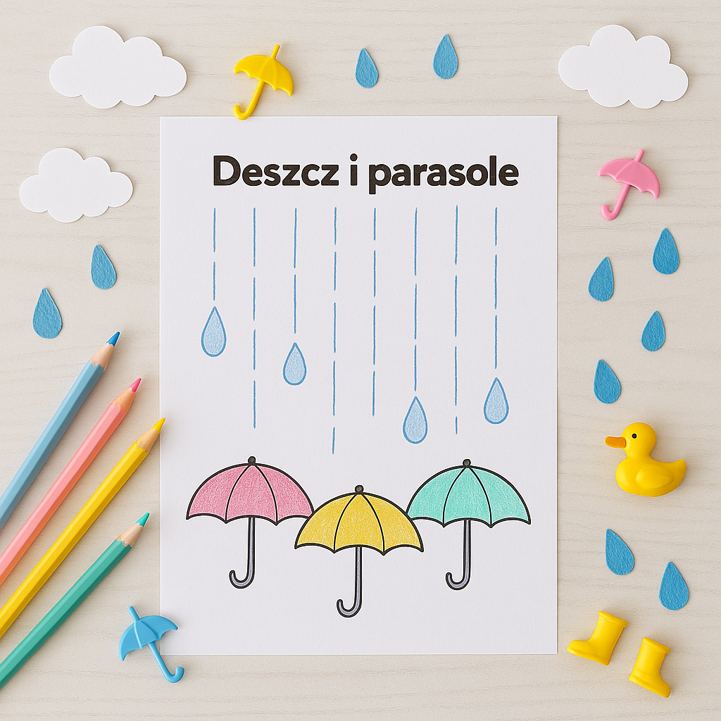 🎨 Zajęcia plastyczne – niech dzieci kolorują krople i parasole na dowolny kolor.