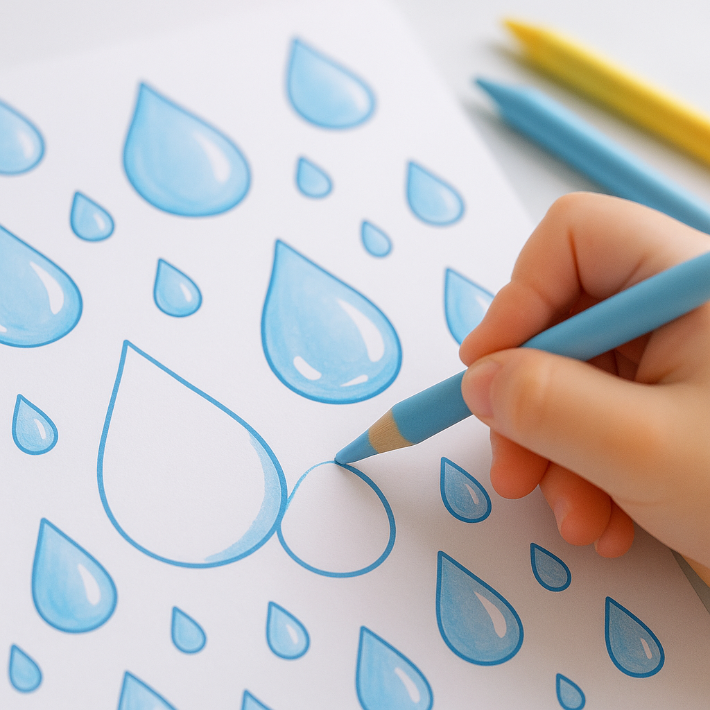 ➡️ Dziecko rysuje po śladzie dużych kropli deszczu, rozwijając umiejętności grafomotoryczne.