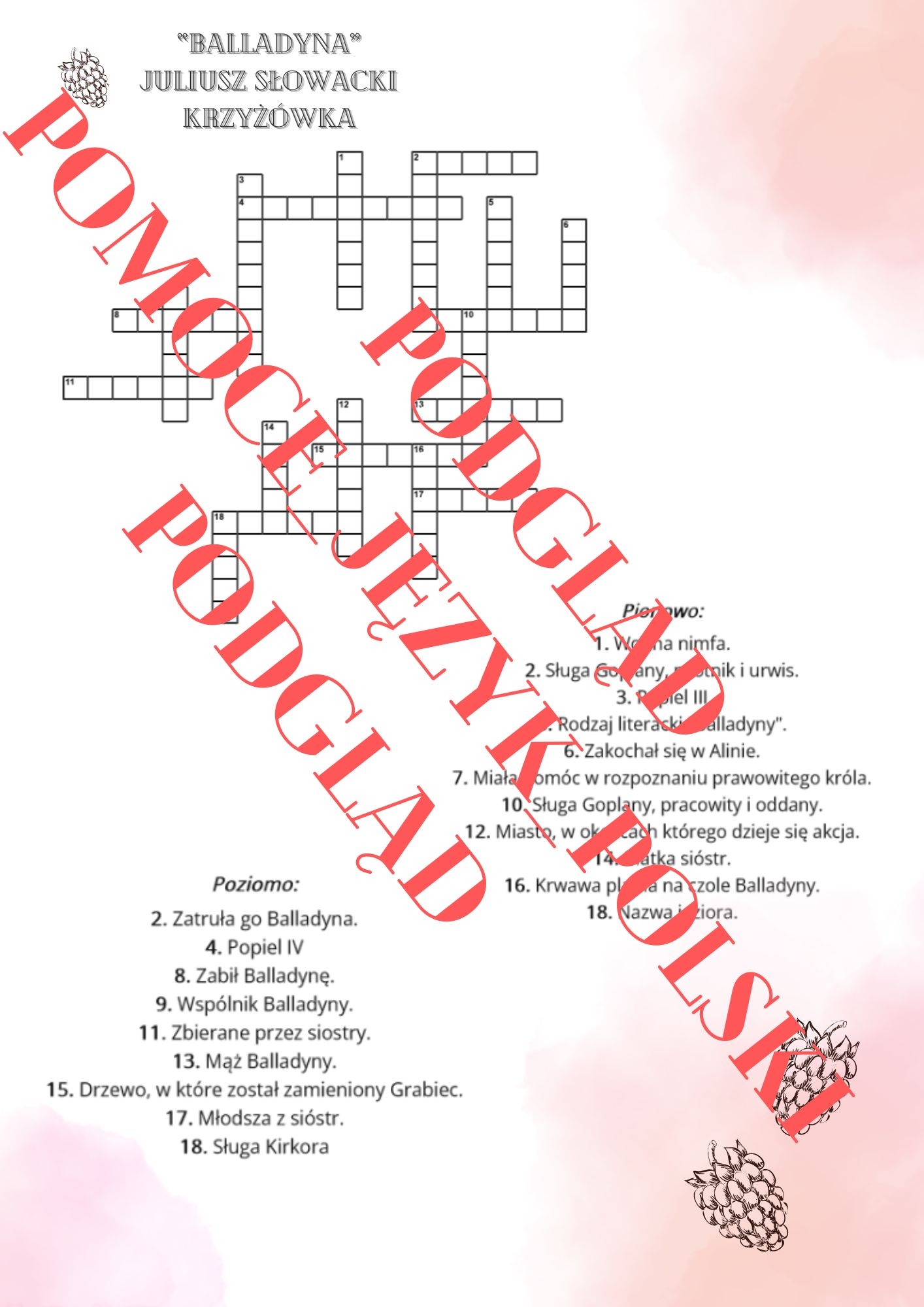 Krzyżówka do lektury "Balladyna"