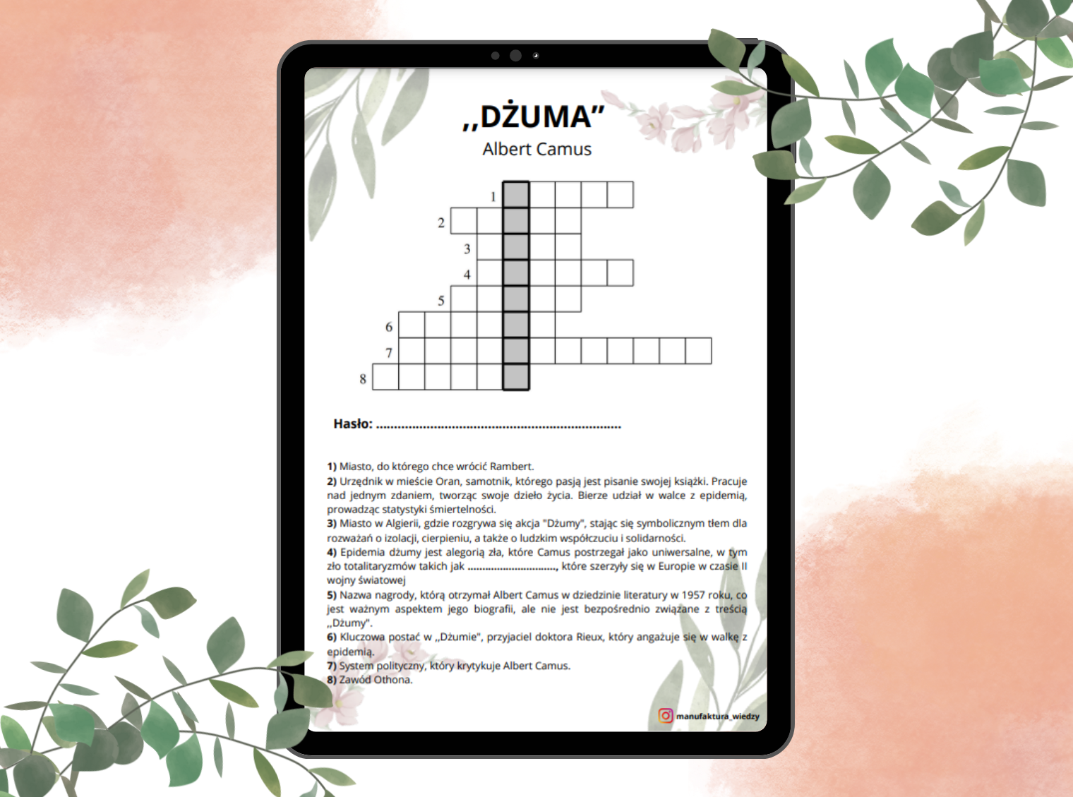 Przedstawiam unikalną krzyżówkę z Dżumy Alberta Camusa, która wzbogaci Wasze lekcje i zainteresuje uczniów głęboką refleksją nad losem człowieka w obliczu katastrofy! Ta krzyżówka pomoże sprawdzić i utrwalić wiedzę z tej lektury.