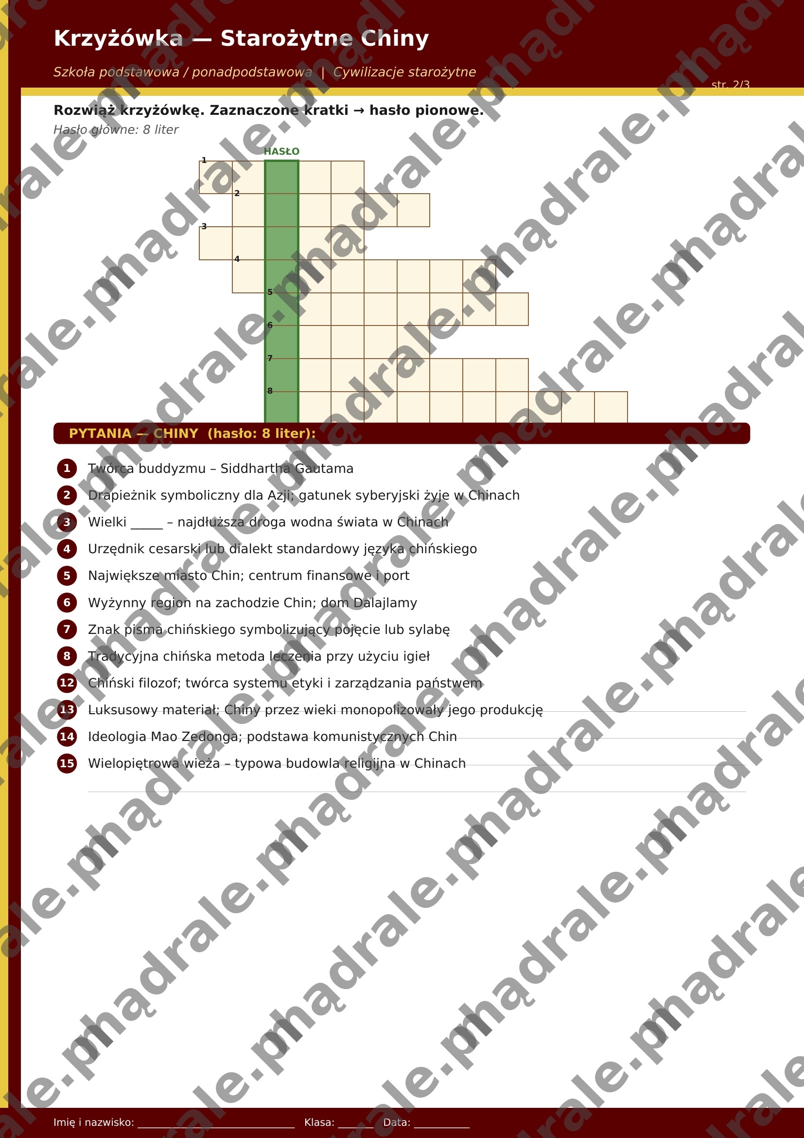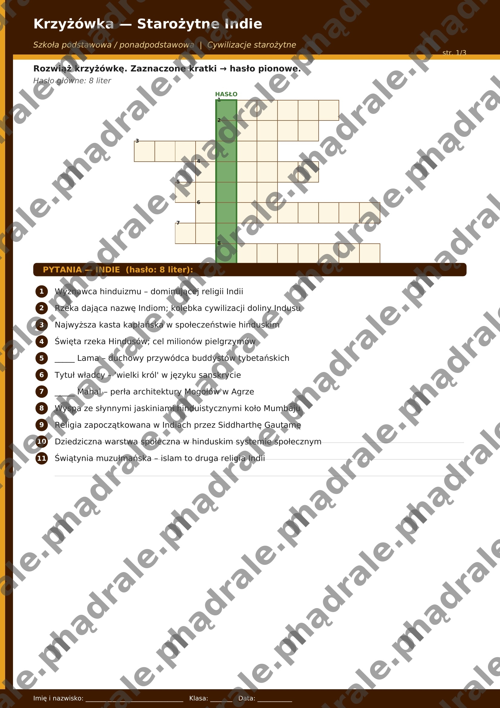🏯 Krzyżówkę tematyczną dotyczącą starożytnych Indii i Chin (m.in. hinduizm, buddyzm, Wielki Mur, dynastia Han, jedwab, kasty).