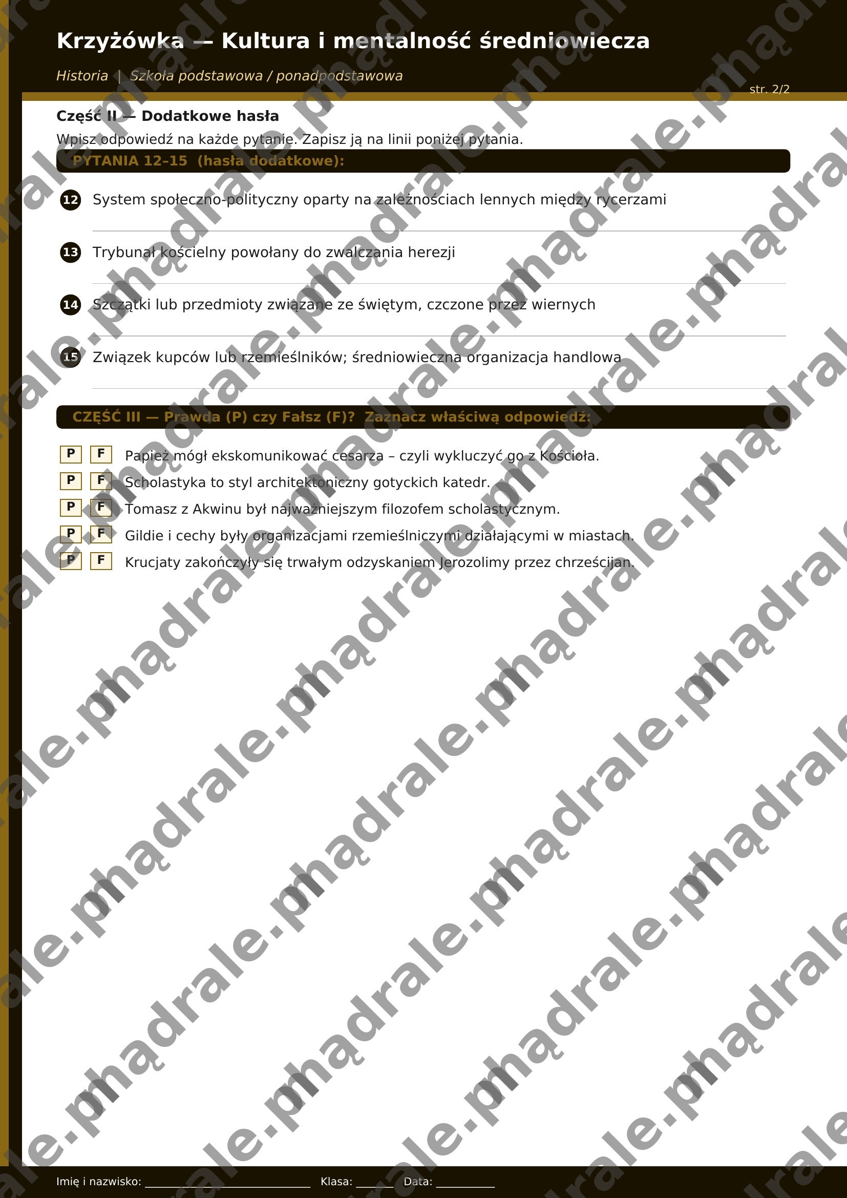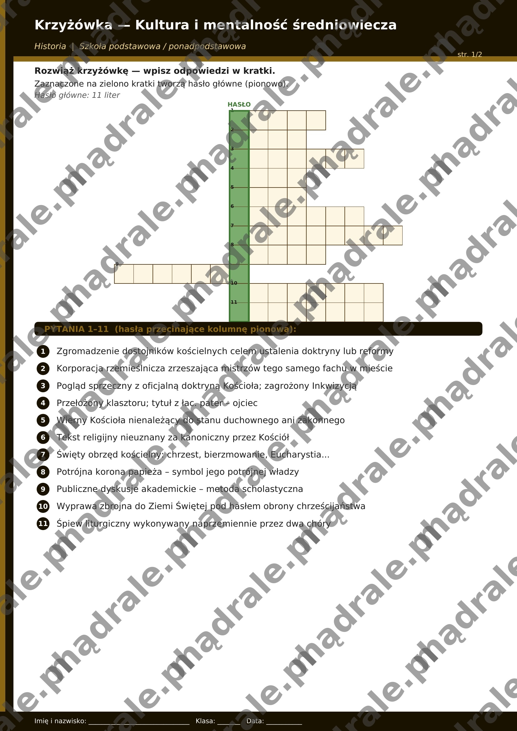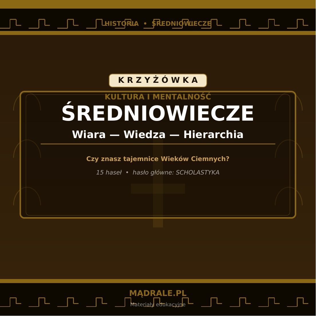 ⚔️ Krzyżówkę tematyczną dotyczącą kultury i mentalności średniowiecza (m.in. rycerstwo, feudalizm, Kościół, scholastyka, pielgrzymki, kodeks rycerski, sztuka romańska i gotycka).