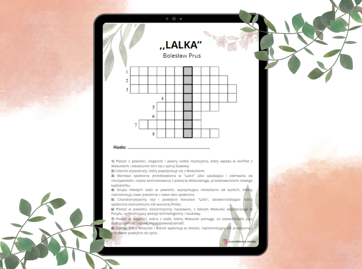 Niech Państwa lekcje staną się jeszcze bardziej inspirujące. Krzyżówka z "Lalki" Bolesława Prusa to doskonały sposób na utrwalenie wiedzy i zainteresowanie uczniów tą ponadczasową powieścią. Dodaj krzyżówkę z "Lalki" do swojego zestawu materiałów dydaktycznych 🛍️ i pozwól swoim uczniom zanurzyć się w świat polskiego pozytywizmu!