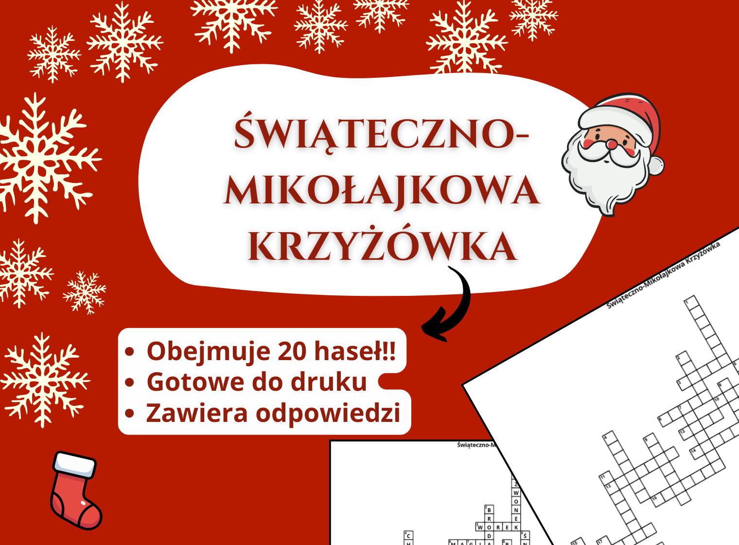 ✅ Krzyżówkę do druku z 20 hasłami o Mikołaju, zimie i świątecznych tradycjach.