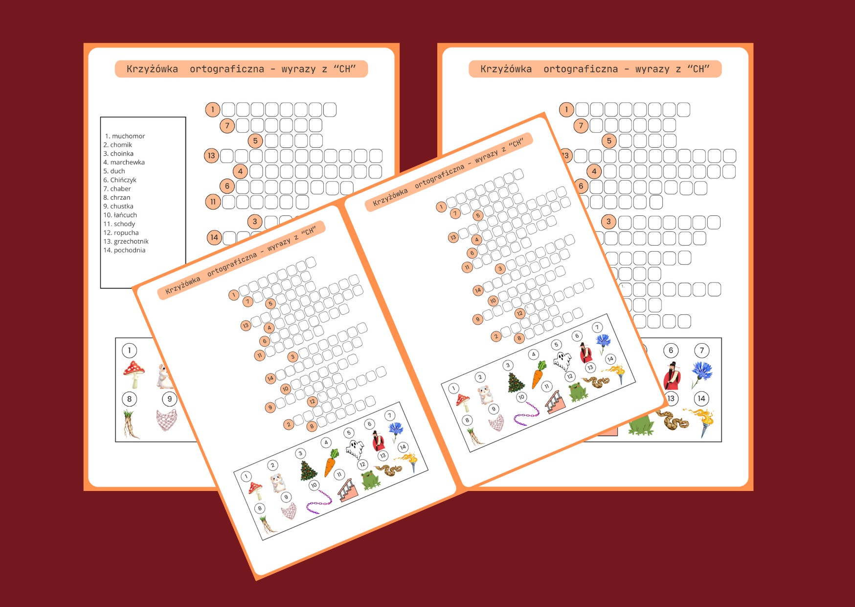 Krzyżówka obrazkowa dotycząca wyrazów z "ch". Po rozwiązaniu wpisane słowa można wykorzystać np. do ćwiczeń ortograficznych lub redakcyjnych.