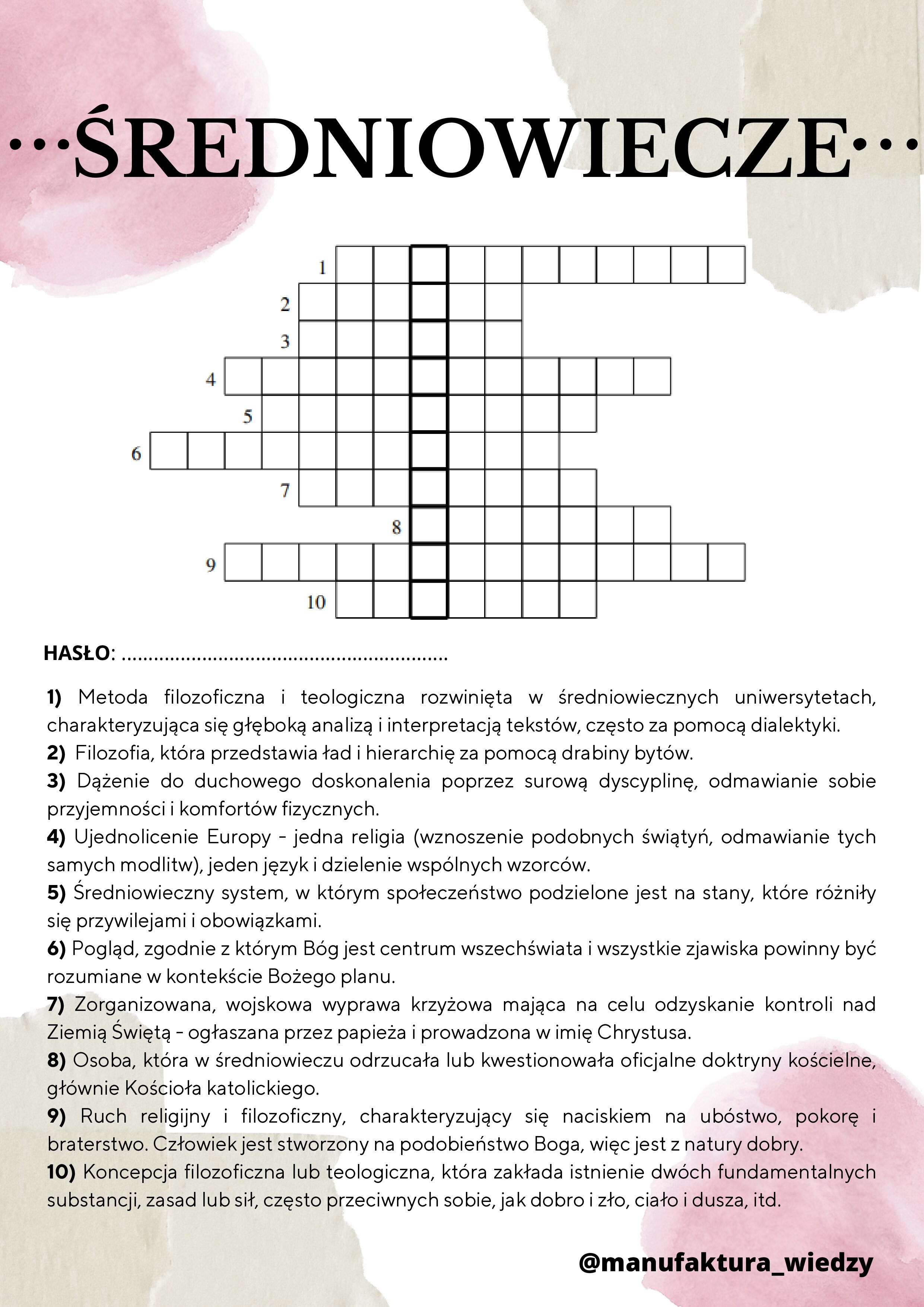 Przedstawiam unikalną krzyżówkę ze średniowiecza, która wzbogaci Wasze lekcje i zainteresuje uczniów fascynującym światem tej niezwykłej epoki! Ta krzyżówka pomoże sprawdzić i utrwalić wiedzę z:
