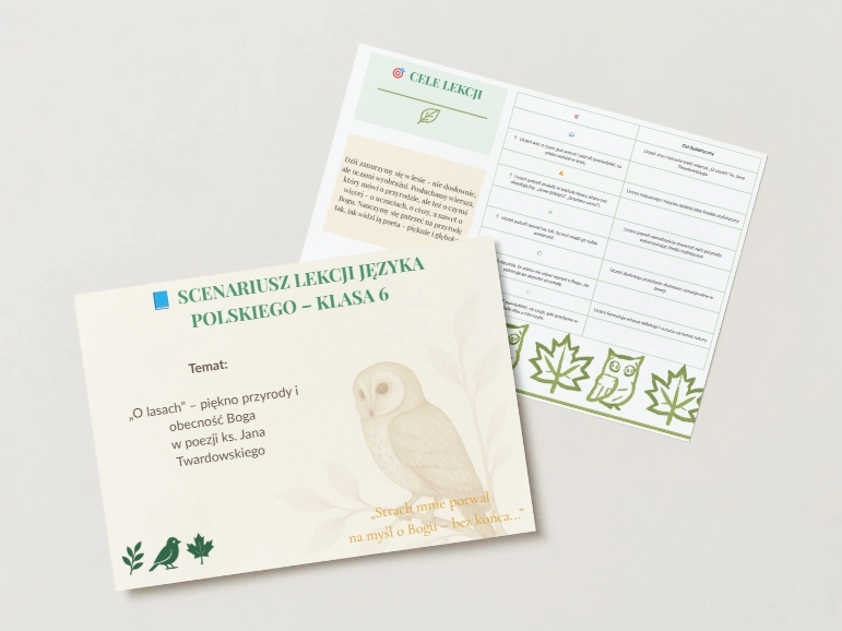 Zanurz się z uczniami w poetycki las pełen emocji, ciszy i… obecności Boga. 🕊️ Ten gotowy scenariusz lekcji języka polskiego dla klasy 6 to niezwykła podróż przez wiersz ks. Jana Twardowskiego „O lasach”, która rozwija nie tylko kompetencje językowe, ale też wrażliwość i refleksyjność. 💬🌲