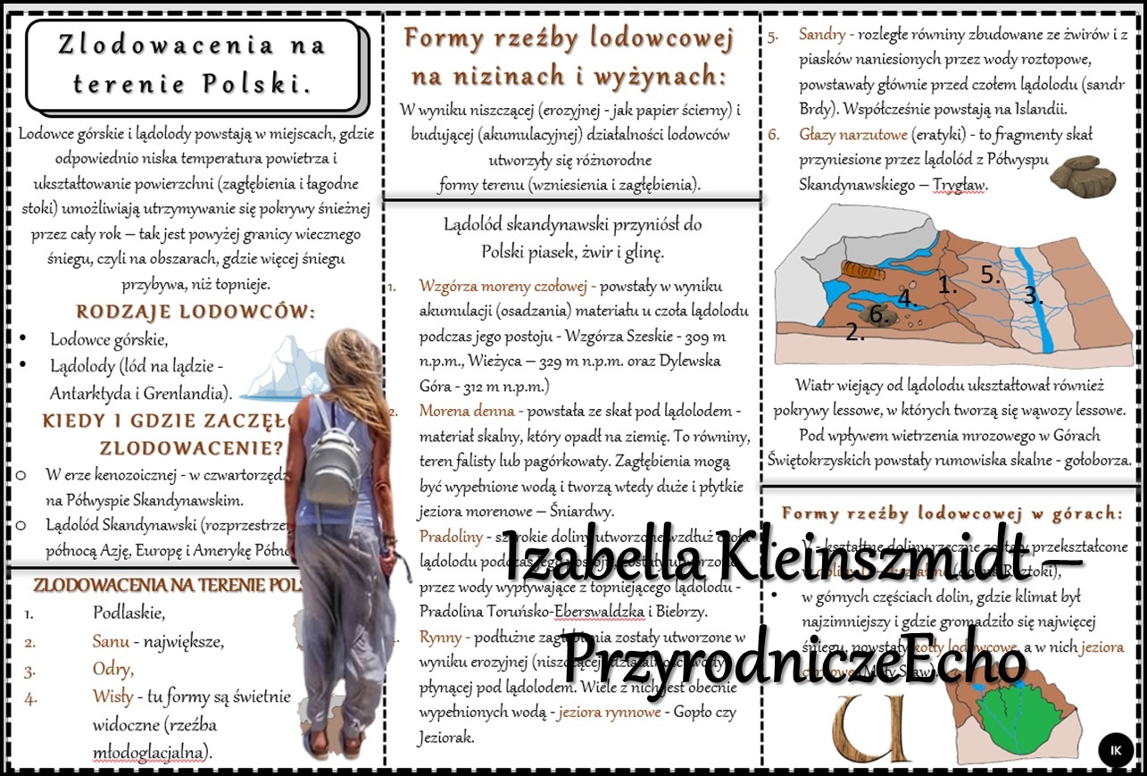Książeczka/sketchnotka/notatka/wklejka/ściąga dla ucznia i przypomnienie dla nauczyciela/edukacja domowa. Temat „Zlodowacenia na terenie Polski” w pdf. Geografia 7, dział „Środowisko przyrodnicze Polski”. Materiał wykonany na podstawie podręcznika z wyda