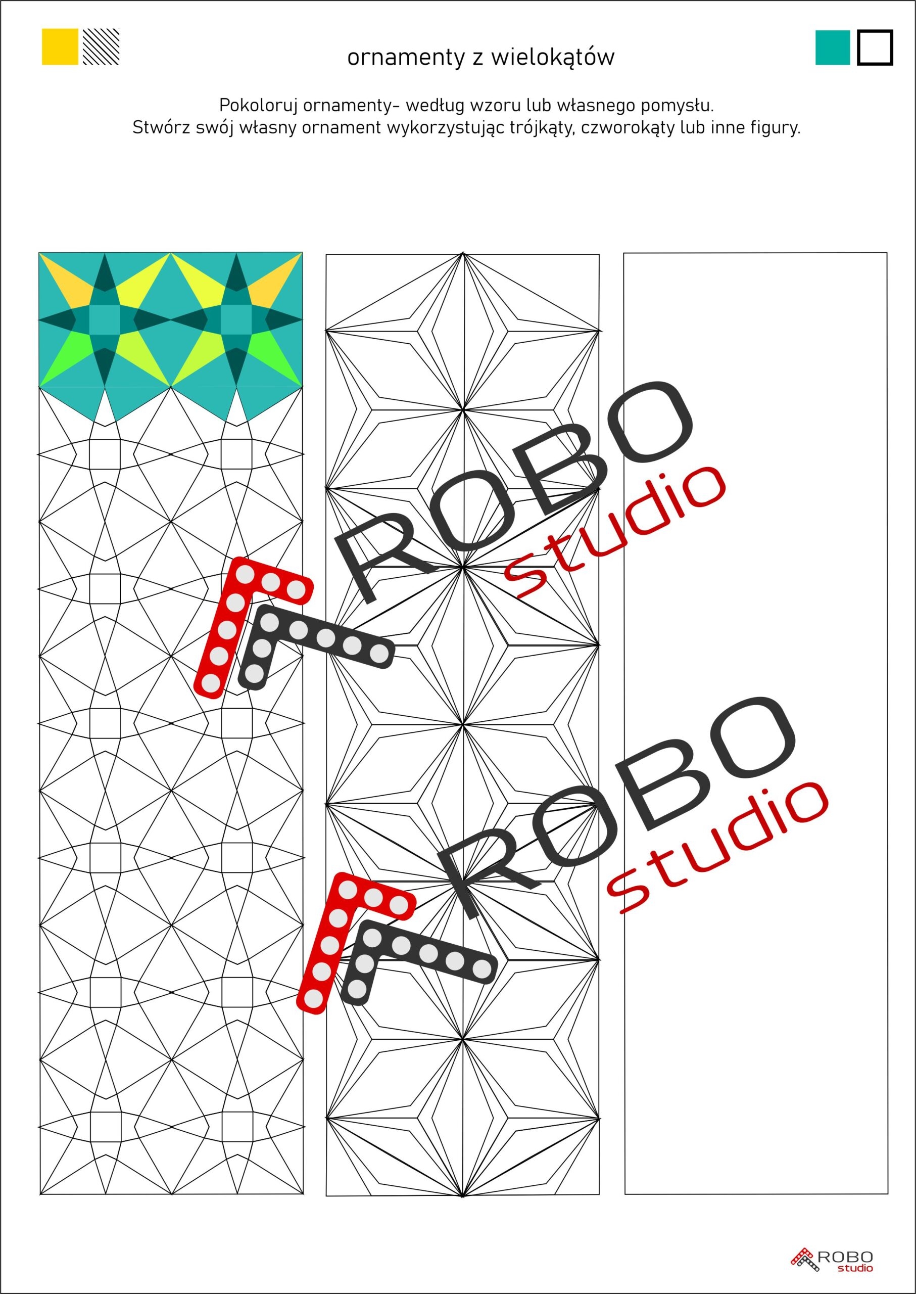 Twórcza kolorowanka- do samodzielnego dokończenia. Łączymy matematykę i sztukę- ornamenty z figur geometrycznych . Format a4, do wydruku. Do wykorzystania na lekcjach plastyki, sztuki, a może matematyki?
