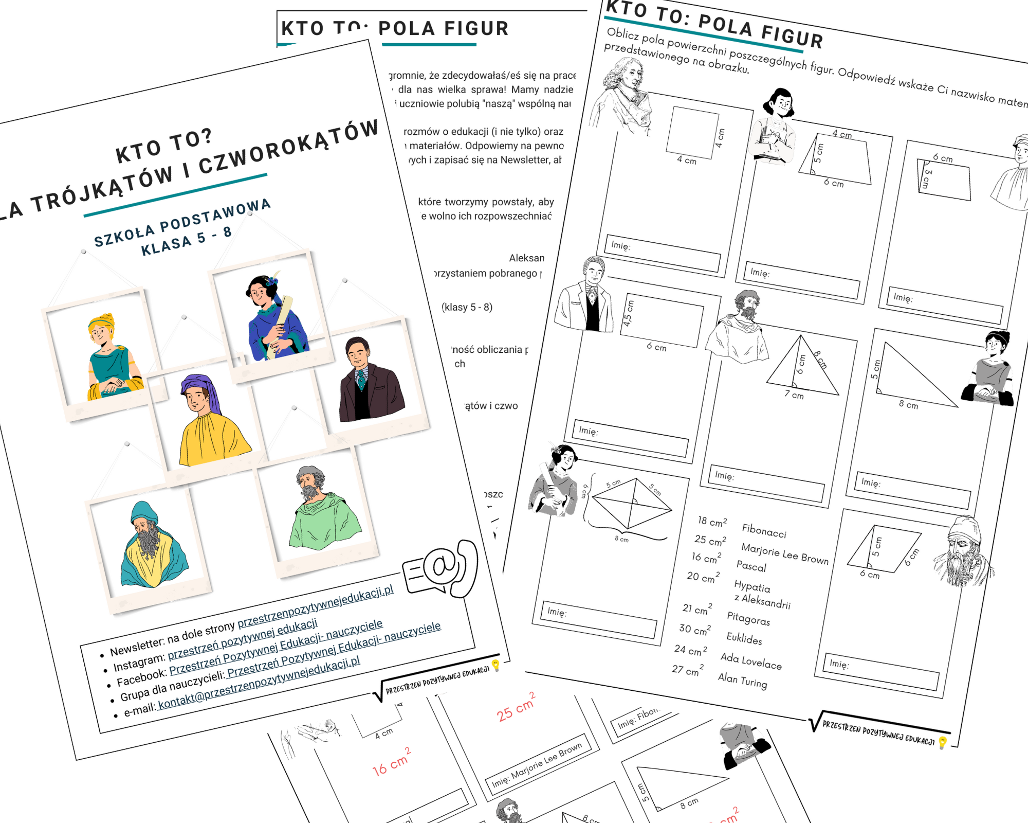 Karta pracy, w której oprócz ćwiczeń z obliczania pola powierzchni trójkątów i czworokątów, uczniowie poznają sylwetki znanych matematyków i matematyczek.
