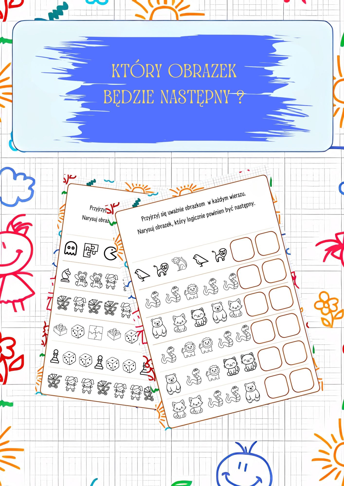Zestaw zadań, który stanowi świetną metodę, aby rozwijać umiejętność logicznego myślenia u dziecka, szczególnie umiejętność analizy wzorców i wyciągania sensownych wniosków. W każdym zadaniu zestawu dziecko ma do wyboru różne układy obrazków, z których każdy powtarza pewną zasadę w ich rozmieszczeniu. Dziecko musi dokładnie przyjrzeć się każdej linii aby móc kontynuować układanie obrazków w sekwencji, rysując obrazek, który powinien być następny.