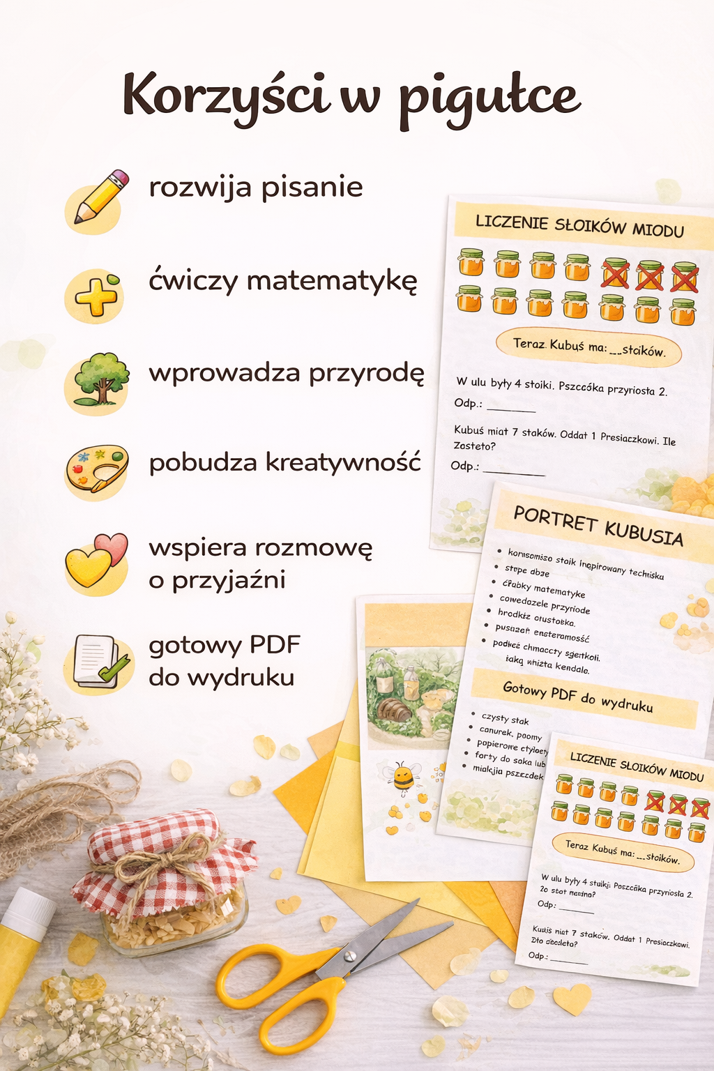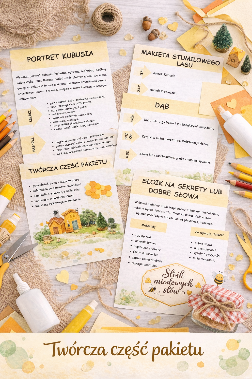 Pakiet zawiera pomysły na portret Kubusia, makietę Stumilowego Lasu, papierowy plaster miodu z cechami dobrego przyjaciela oraz słoik na sekrety lub dobre słowa, który może stać się piękną klasową lub domową aktywnością wzmacniającą relacje i pozytywne emocje. To właśnie te elementy sprawiają, że materiał jest nie tylko edukacyjny, ale też ciepły, wartościowy i naprawdę zapadający w pamięć.