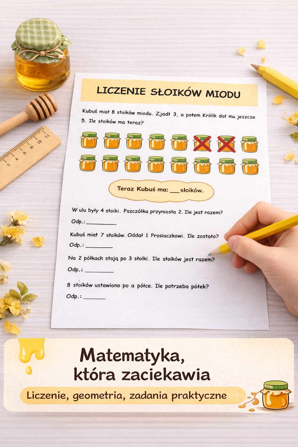 Dzieci rozwiązują ćwiczenia związane z liczeniem słoików miodu, pracują z geometrią plastra miodu, a także wykonują zadanie „Miodowa kuchnia”, w którym liczą porcje, łyżeczki, mililitry i sprawdzają, czy zapas miodu wystarczy dla większej liczby osób. To świetny sposób na połączenie nauki z fabułą, która naprawdę wciąga.