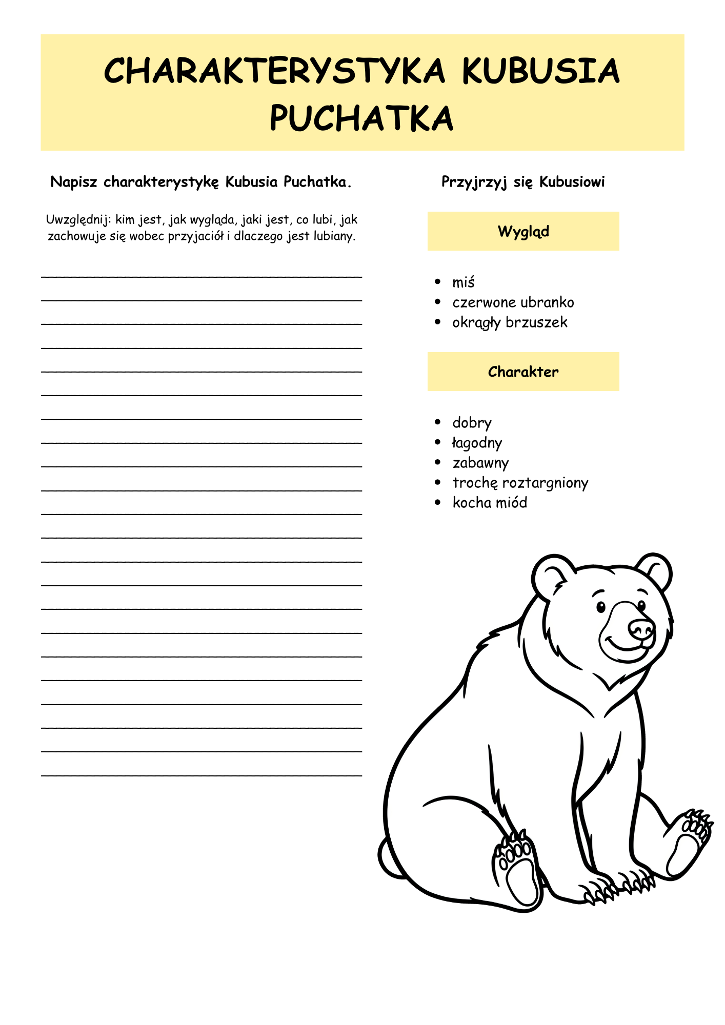 W pakiecie czekają na dzieci zadania rozwijające wyobraźnię, umiejętność pisania i budowania wypowiedzi. Uczniowie przygotowują charakterystykę Kubusia Puchatka, opisują Stumilowy Las z użyciem zmysłów, piszą list do Kubusia, tworzą dziennik Prosiaczka i układają opowiadanie o tajemniczym zniknięciu miodu. Dzięki temu materiał znakomicie wspiera rozwój języka, słownictwa, samodzielnego myślenia i swobodnego wyrażania emocji.