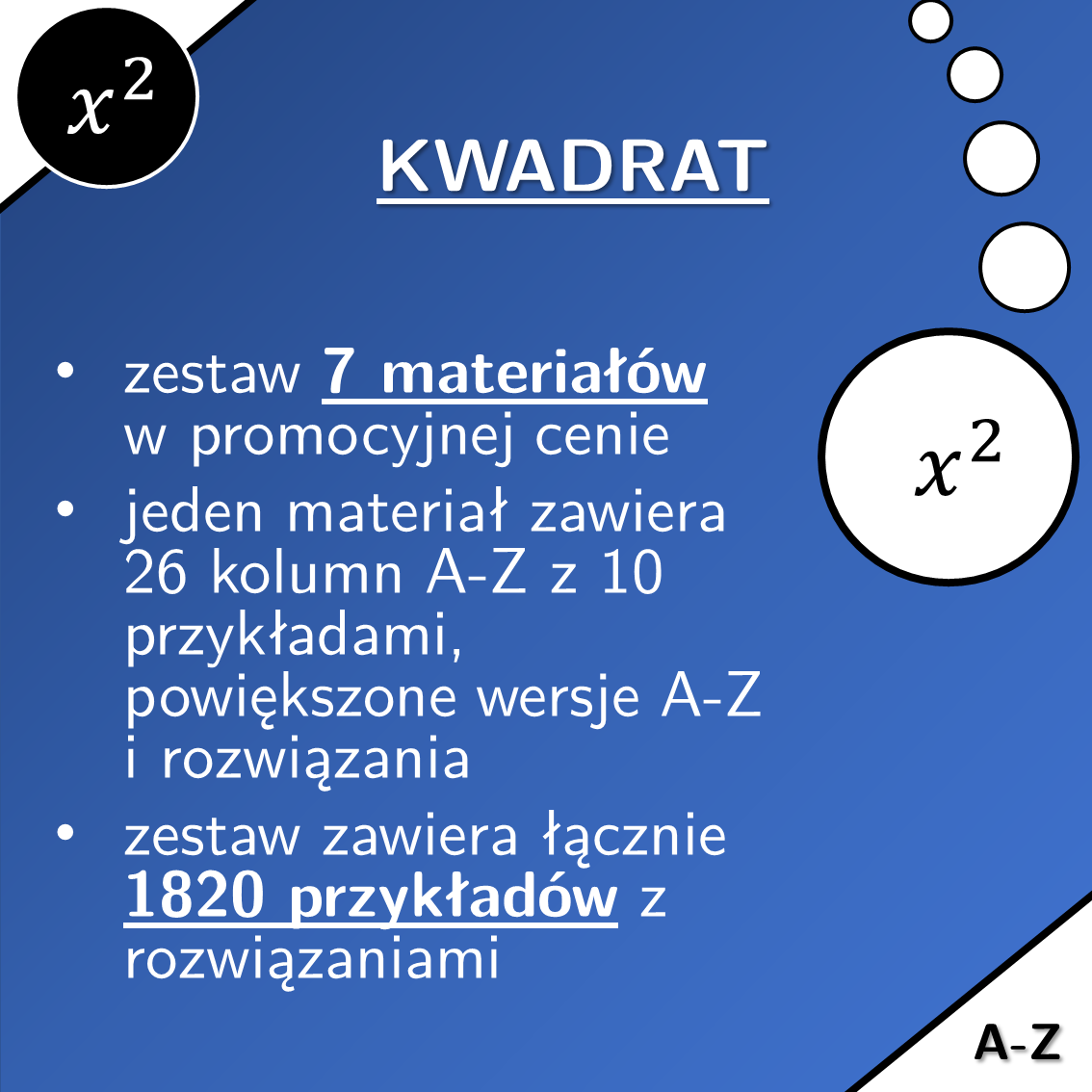W materiale znajduje się zestaw 7 materiałów z matematyki dotyczących kwadratu dla klasy 8 w cenie promocyjnej.
