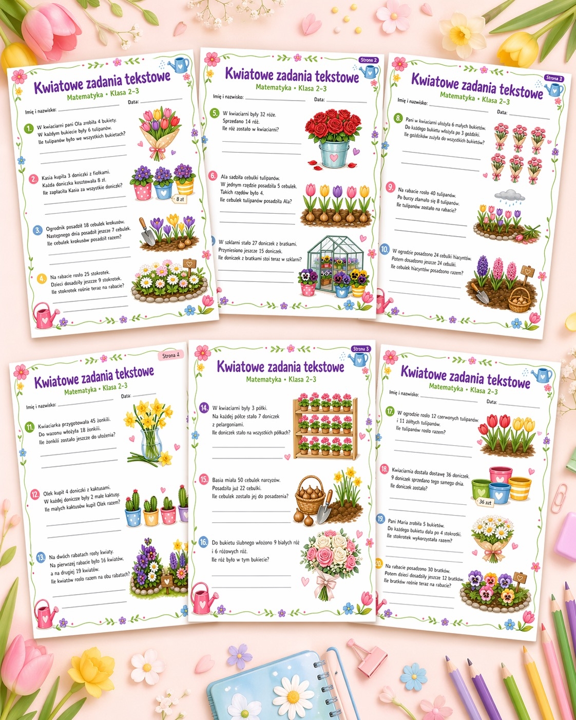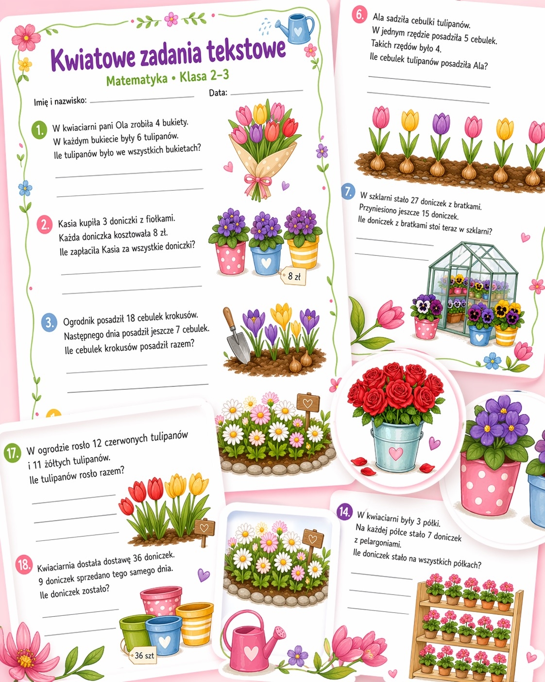 „Kwiatowe zadania tekstowe” to kolorowy, przyjazny dzieciom materiał matematyczny dla uczniów klas 2–3. Zawiera 20 prostych i angażujących zadań tekstowych związanych z kwiatami, bukietami, kwiaciarnią, doniczkami, cebulkami i rabatami. 🌷