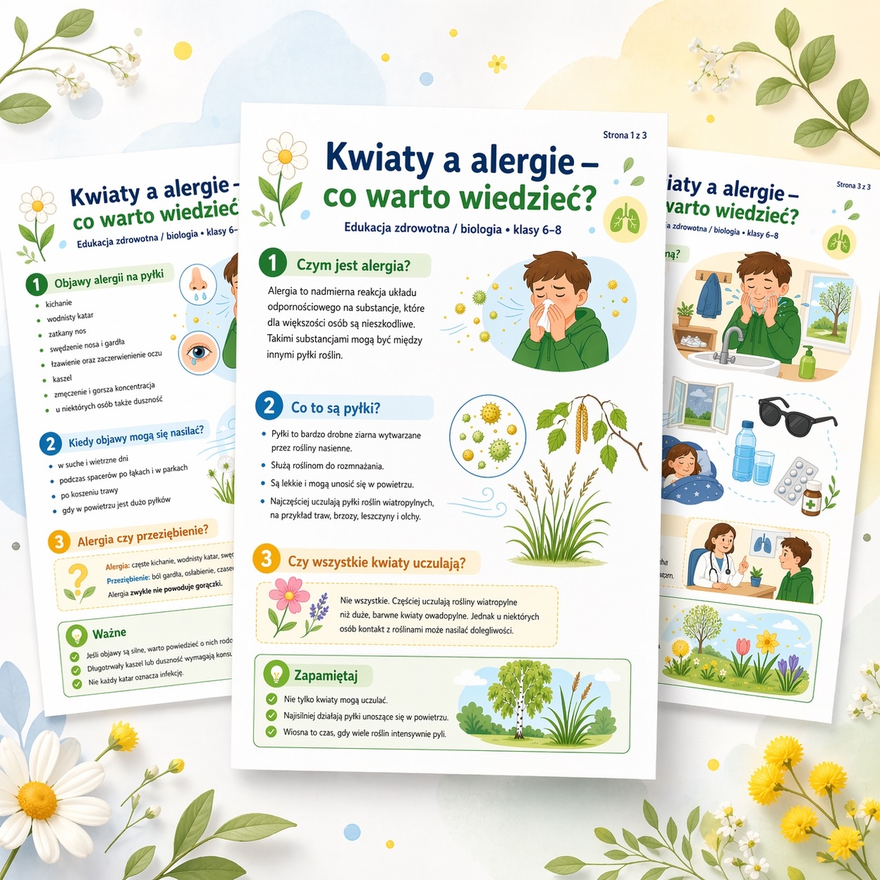 Przygotowałam materiał edukacyjny dla uczniów klas 6–8 o tym, czym jest alergia na pyłki, jakie daje objawy i jak dbać o siebie wiosną. 🌸📚