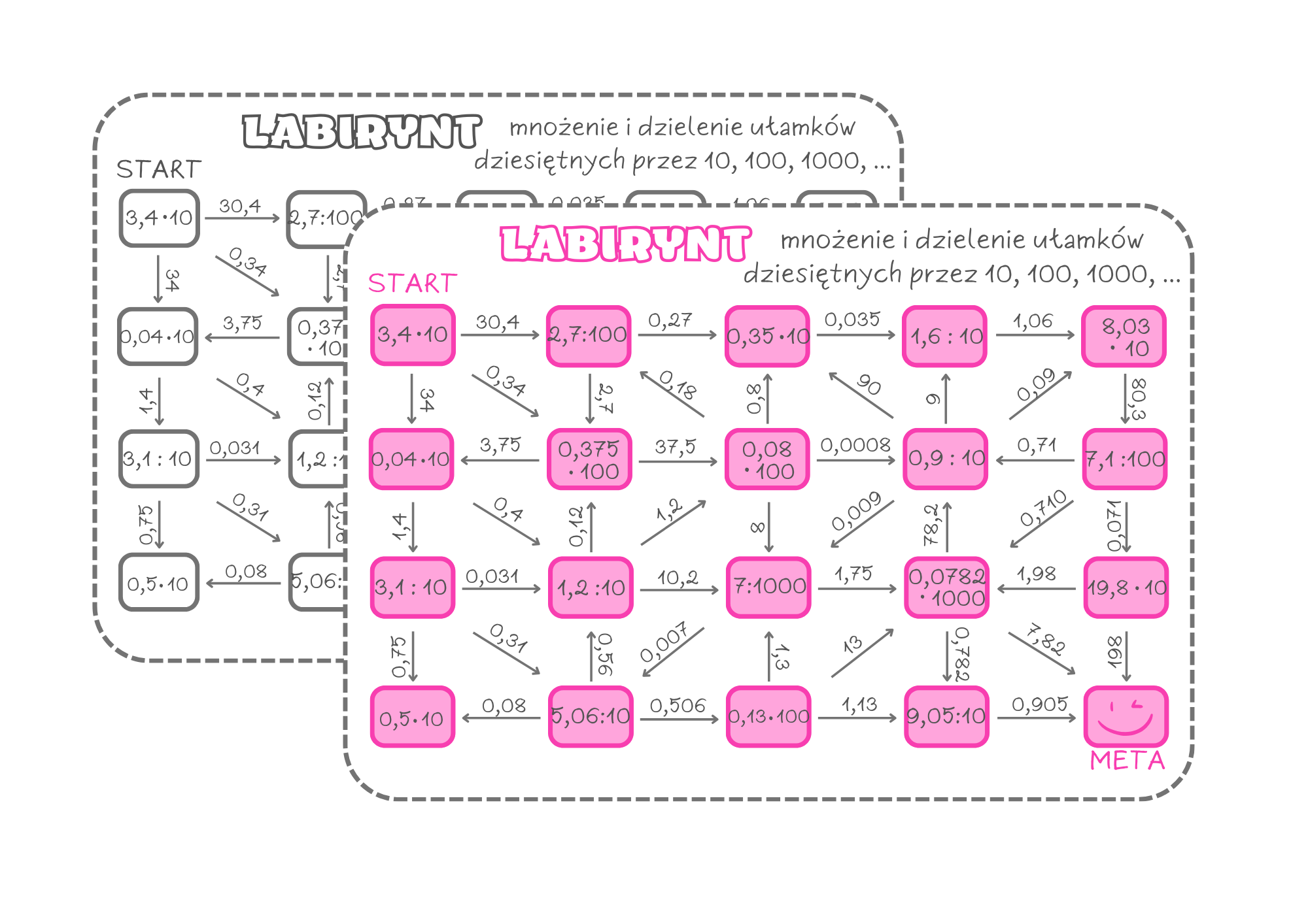 LABIRYNT - mnożenie i dzielenie ułamków dziesiętnych przez 10, 100, 1000. Klasa 4, 5, 6