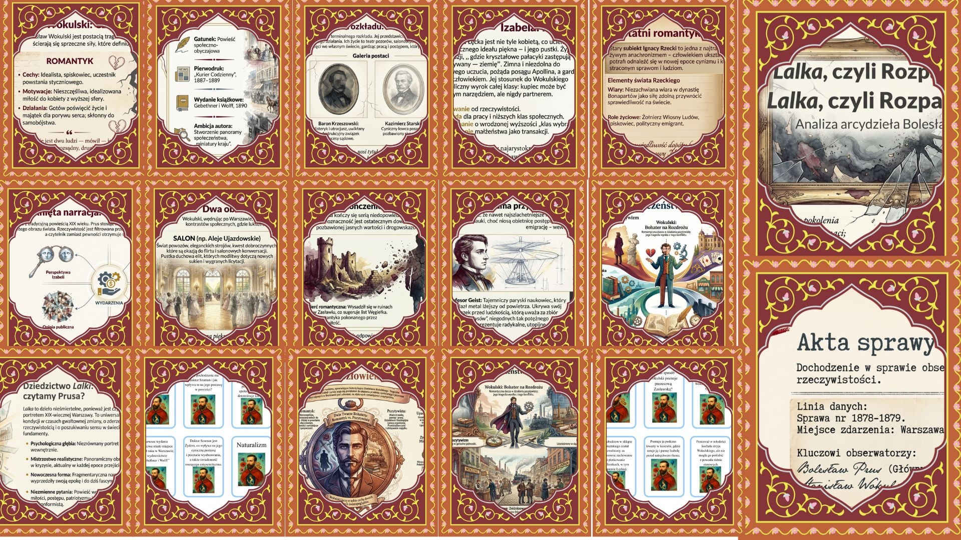 Czy „Lalka” to dla Ciebie tylko „powieść o straconych złudzeniach”? Czy gubisz się w zawiłościach warszawskiej arystokracji i mieszczaństwa? Moja prezentacja PDF to kompleksowe kompendium wiedzy, które w przystępny i nowoczesny sposób przeprowadzi Cię przez najważniejsze aspekty tego arcydzieła literatury polskiej. Co znajdziesz w środku? • Szczegółowa analiza bohaterów: Poznasz Stanisława Wokulskiego jako „romantyka zawieszonego w pozytywizmie”, prześledzisz losy Izabeli Łęckiej – obiektu nieszczęśliwej miłości oraz zajrzysz do duszy Ignacego Rzeckiego, starego subiekta i wiernego bonapartysty. • Panorama społeczeństwa: Prezentacja ukazuje „sąd nad społeczeństwem polskim końca XIX wieku”. Dowiesz się, dlaczego arystokracja jest przedstawiona jako warstwa bierna, a polskie mieszczaństwo jako pozbawione inicjatywy. • Kierunki artystyczne i styl: Wyjaśniam różnice między obecnym w utworze realizmem krytycznym a naturalizmem. Zrozumiesz, na czym polega topograficzna dokładność opisu Warszawy i Paryża. • Symbolika i motywy: Omawiam wieloznaczność tytułu (od zabawki Heluni po topos theatrum mundi) oraz kluczowe motywy, takie jak motyw naukowca (Geist, Ochocki) czy motyw horacjański. • Adaptacje i odbiór: Dowiesz się, jak utwór oceniali krytycy oraz poznasz najważniejsze ekranizacje (film Hasa i kultowy serial Bera). Ponadto w pakiecie znajdują się karty pracy do tematu i fiszki. Dlaczego warto wybrać tę prezentację? Opracowana na podstawie fachowych analiz literackich i źródeł historycznych. Idealna do powtórek przed maturą lub jako materiał pomocniczy dla nauczycieli. Od genezy utworu (proces o kradzież lalki) aż po otwarte zakończenie losów Wokulskiego. Zainwestuj w wiedzę o „najnowocześniejszej powieści polskiego pozytywizmu”!