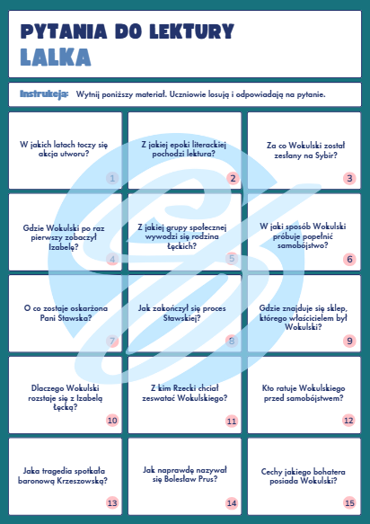 Szukasz skutecznej pomocy dydaktycznej do pracy z „Lalką” Bolesława Prusa? Nasz zestaw 15 pytań i odpowiedzi do tej obowiązkowej lektury szkolnej to idealne rozwiązanie dla nauczycieli! Pytania przygotowane w formie kart, które można losować, sprawiają, że lekcje są interaktywne i angażujące dla uczniów. Dzięki temu metoda pracy staje się bardziej przyjazna i ciekawa, a uczniowie z większym entuzjazmem podchodzą do omawiania treści. Doskonała pomoc edukacyjna, która ułatwia przygotowanie do sprawdzianów i egzaminów z języka polskiego.