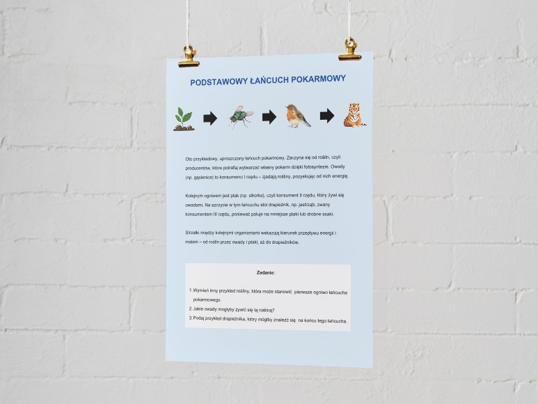 Wybierając „ŁAŃCUCHY I SIECI POKARMOWE”, otrzymujesz kompletny i dopracowany materiał, który przeniesie młodych odkrywców w fascynujący świat natury – pełen barw, ciekawostek i zadań pobudzających kreatywność. Zamów już teraz i wprowadź dzieci w ekologiczną przygodę!
