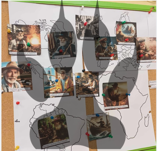 Dla lepszego zobrazowania historii Skawińskiego, proponuję gazetkę tematyczną. Losy bohatera umieszczone na mapie świata. Podpisy mogą przygotować uczniowie:) Obrazki zostały wygenerowane przez sztuczną inteligencję.