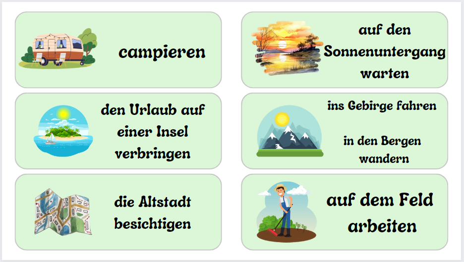 Karty obrazkowe mają za zadanie wdrożyć i przećwiczyć słownictwo związane z możliwościami spędzania wolnego czasu/urlopu w czasie letnich wakacji.