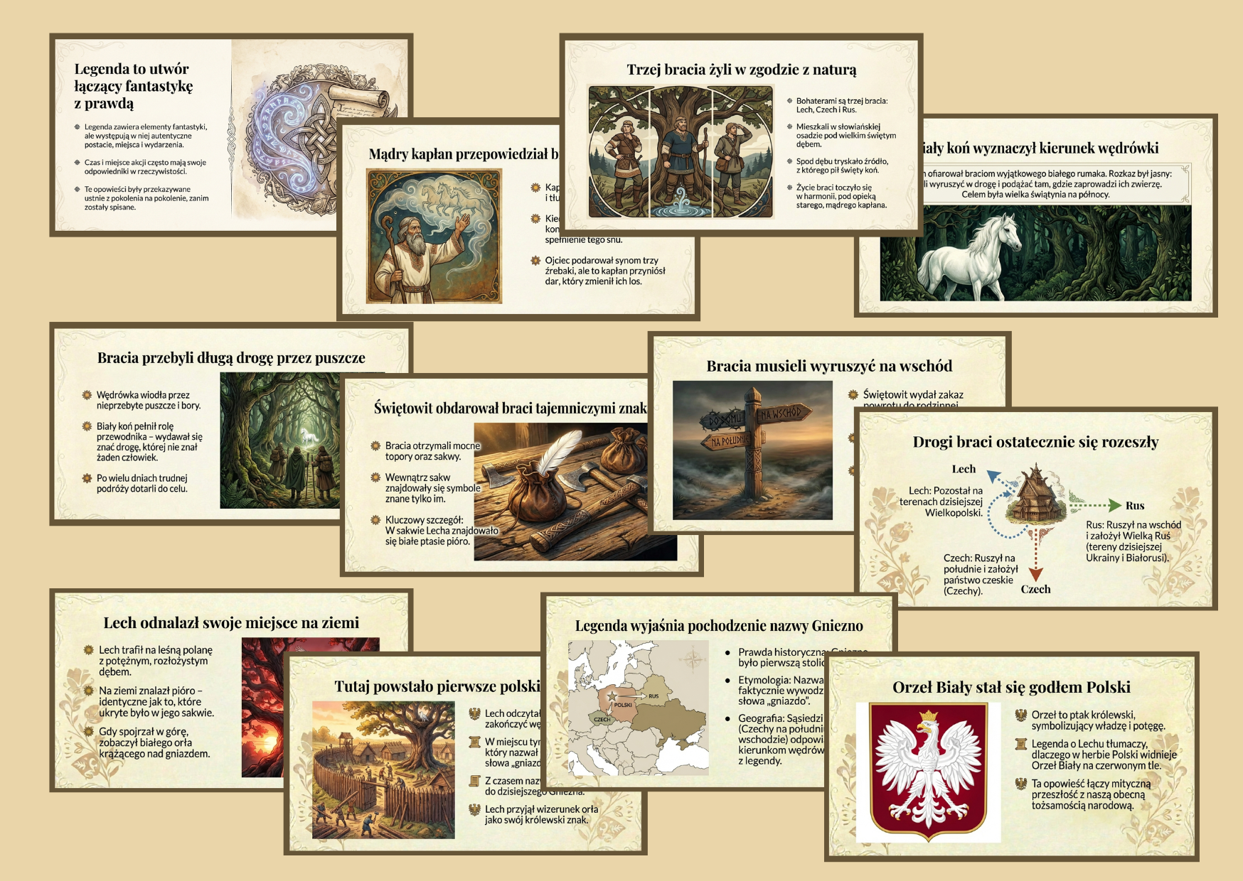 Edukacyjna i atrakcyjna wizualnie prezentacja multimedialna oparta na legendzie o Lechu, Czechu i Rusie. Materiał w przystępny sposób przybliża uczniom jedną z najważniejszych polskich legend, łącząc pełną treść opowieści z klarownym, uporządkowanym tekstem narracyjnym. Dodatkowo - tekst legendy w pdf (word).