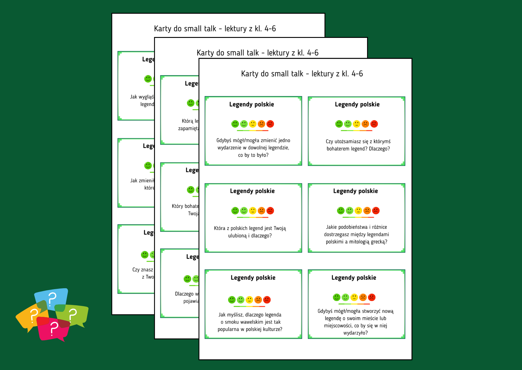 18 pytań typu „Karty small talk” do legend polskich. Takie pytania mają charakter swobodny, zachęcają do refleksji, rozmowy i dzielenia się opinią, a nie tylko sprawdzają wiedzę. Mogą być wykorzystywane na lekcjach jako forma integracji z lekturą lub podczas luźniejszych rozmów literackich. Dzięki nim można ćwiczyć wypowiedź argumentacyjną. Zasady: uczeń losuje kartę i odpowiada na pytanie (lub wszyscy uczniowie odpowiadają na to samo pytanie).