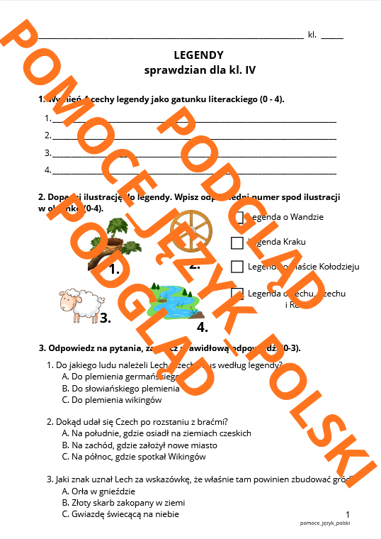 Oferuję gotowy sprawdzian dla klasy 4 z języka polskiego, przygotowany na podstawie czterech polskich legend: