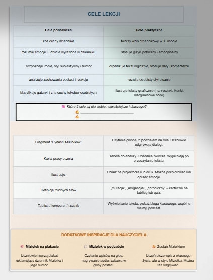Ten gotowy scenariusz lekcji języka polskiego oparty na "Dynastii Miziołków" Joanny Olech to zabawna i angażująca podróż przez świat dzienników, młodzieżowego języka i refleksji. Idealny do wykorzystania na lekcjach, zajęciach świetlicowych czy korepetycjach! 👩🏫👨🎓
