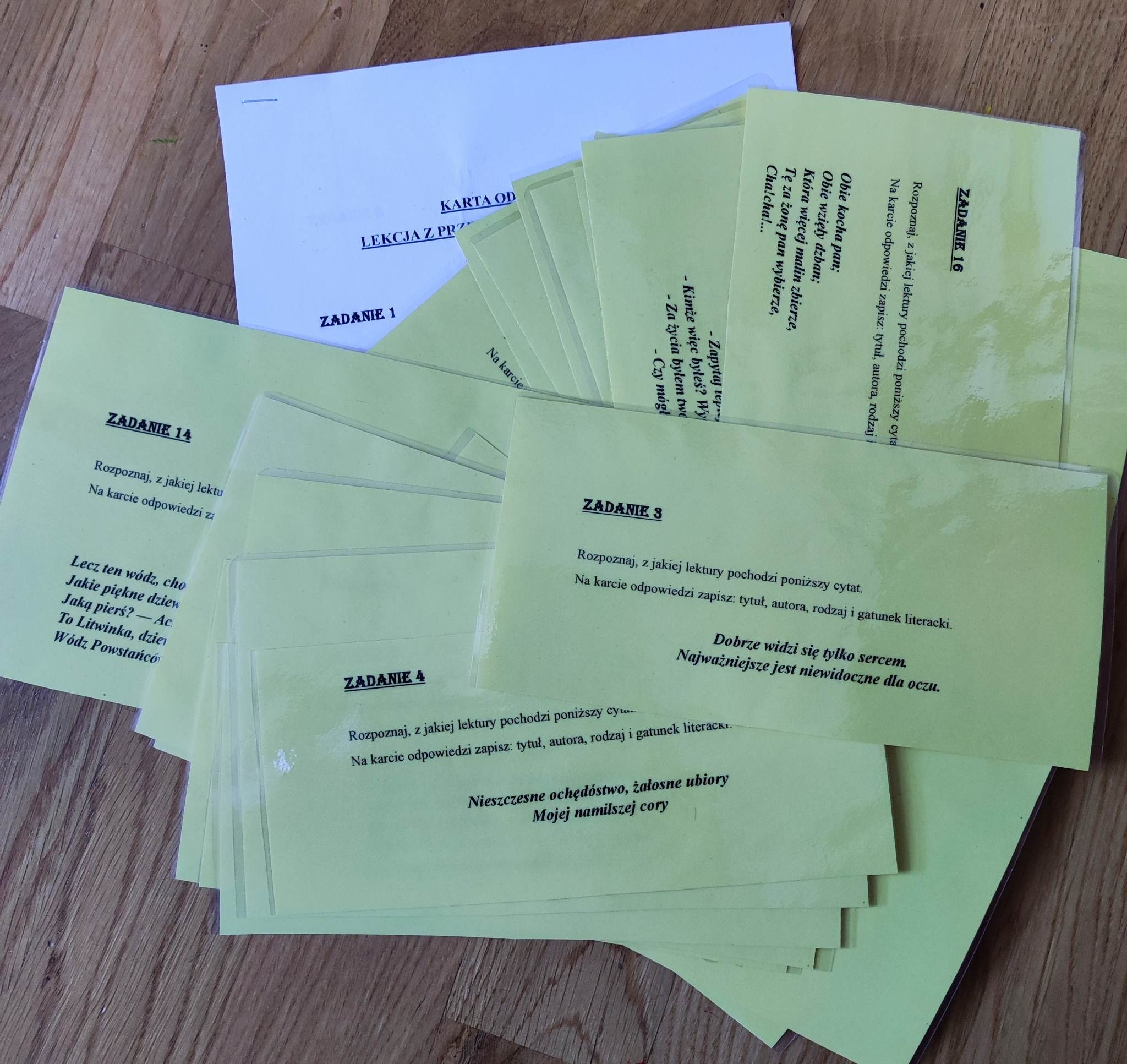 Lekcja z przesiadką- cytaty E8 składa się z 30 pytań, na których zamieszczone są cytaty z lektur obowiązujących na egzaminie ósmoklasisty. Do zestawu dołączone są: karty z odpowiedziami oraz karta odpowiedzi. Aby przeprowadzić taką lekcję, należy wcześniej ułożyć stoliki w tzw. podkowę, na każdym stoliku położyć karteczkę z danym zadaniem (najlepiej przykleić taśmą do stołu, aby kartki nie fruwały podczas zmiany miejsc przez naszych uczniów). Uczniowie zajmują miejsca, każdy otrzymuje kartę odpowiedzi, na której się podpisuje i którą trzyma cały czas przy sobie. Przed rozpoczęciem należy się z uczniami umówić, że po upływie konkretnego czasu (1,5 - 2 min) nauczyciel mówi słowo : PRZESIADKA, wtedy każdy uczeń przesiada się o jedno krzesełko i tak aż dojdzie do miejsca, które zajmował na samym początku. W ten sposób przeprowadzone zajęcia na pewno pozostaną na długo w pamięci naszych uczniów, będą lekcją koncentracji i samodyscypliny a także świetnym sposobem na sprawdzenie wiedzy z lektur, rodzajów i gatunków literackich. Taka lekcja sprawdzi się też na zastępstwie w kl. 8.