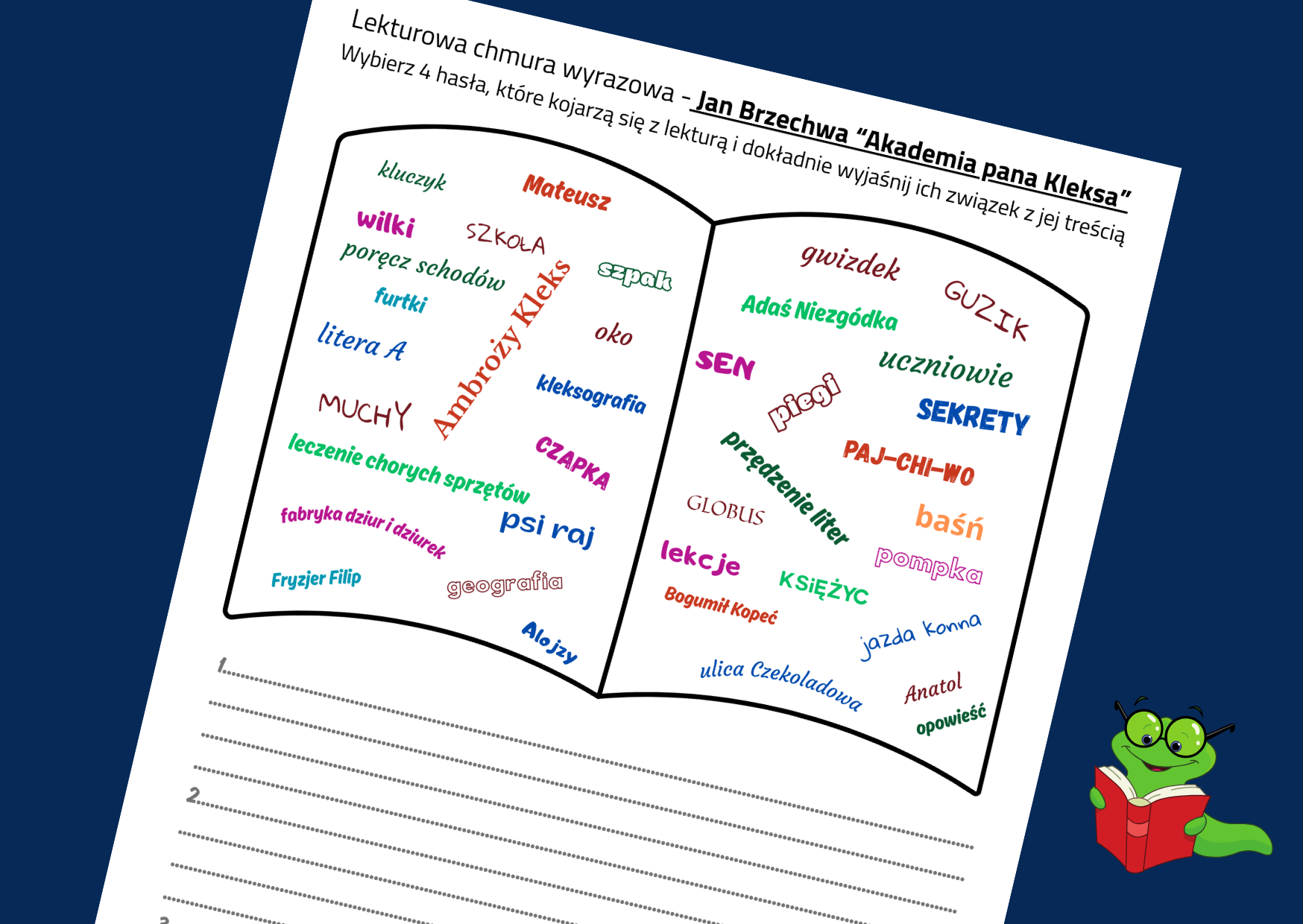Karta pracy z chmurą wyrazową ze słowami kojarzącymi się z "Akademią pana Kleksa" . Zadaniem uczniów jest wyjaśnienie związku haseł z treścią lektury.