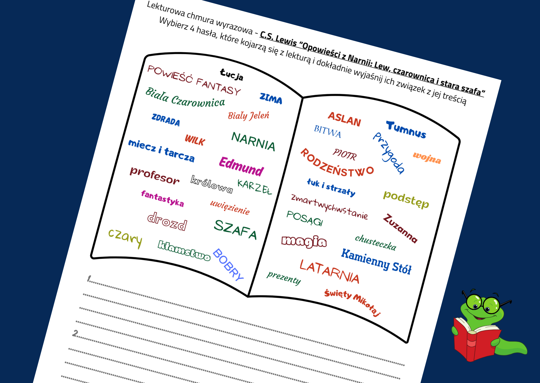 Karta pracy z chmurą wyrazową ze słowami kojarzącymi się z "Opowieściami z Narnii" . Zadaniem uczniów jest wyjaśnienie związku haseł z treścią lektury.
