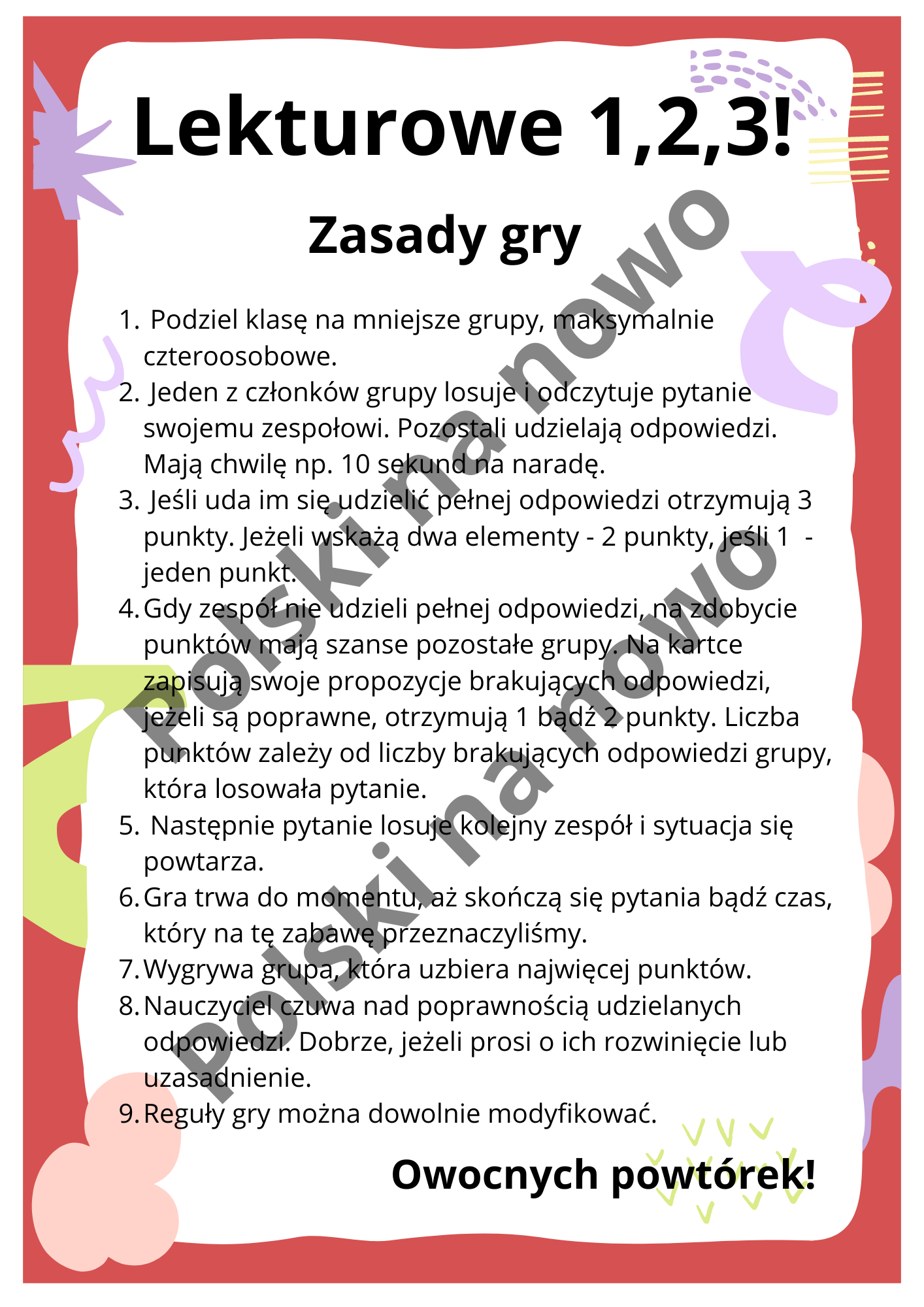 Zestaw zawiera 60 kart z pytaniami dotyczącymi lektur z klas 4-8, które mogą pojawić się na egzaminie ósmoklasisty od 2025 roku oraz instrukcję. Gra polega na szybkim odpowiadaniu na pytania w określonym czasie. Doskonała powtórka przed egzaminem.