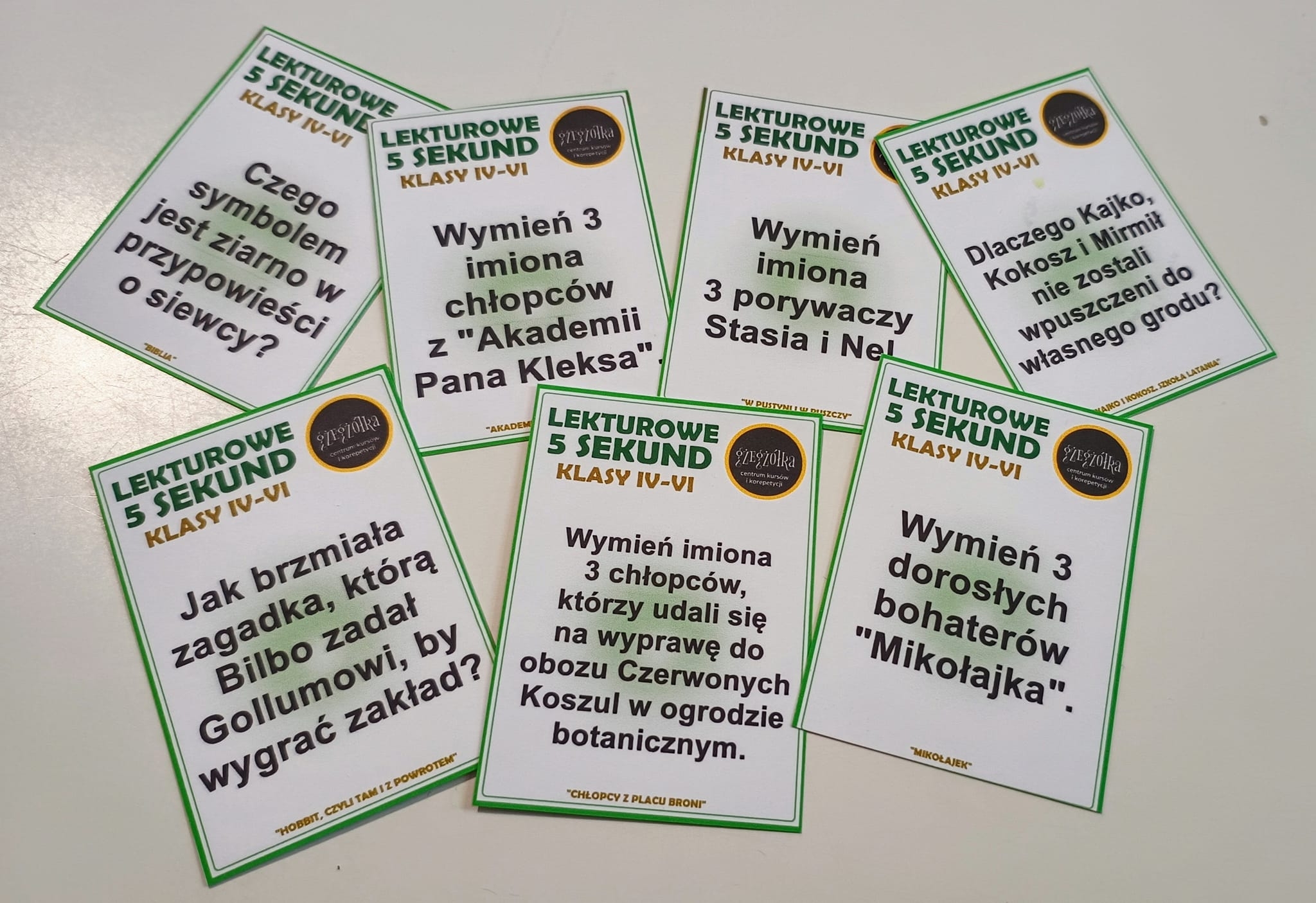 Karty dotyczą lektur: Akademia Pana Kleksa (15), Biblia (20), Chłopcy z Placu Broni (12), Hobbit (12), Kajko i Kokosz (13), Mikołajek (12), Opowieści z Narnii (14), W Pustyni i w puszczy (16), Mitologia grecka (35).