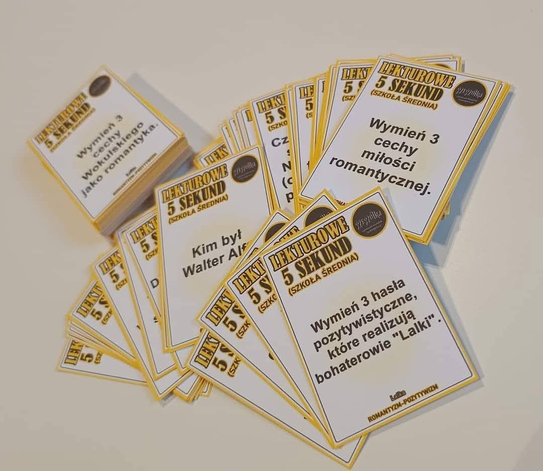 Karty do znanej gry w 5 sekund, zawierające pytania do obowiązkowych lektur maturalnych z romantyzmu i pozytywizmu. Świetnia forma sprawdzenia wiedzy w zabawowej formie i okazja do powtórki najważniejszych faktów z utworów.