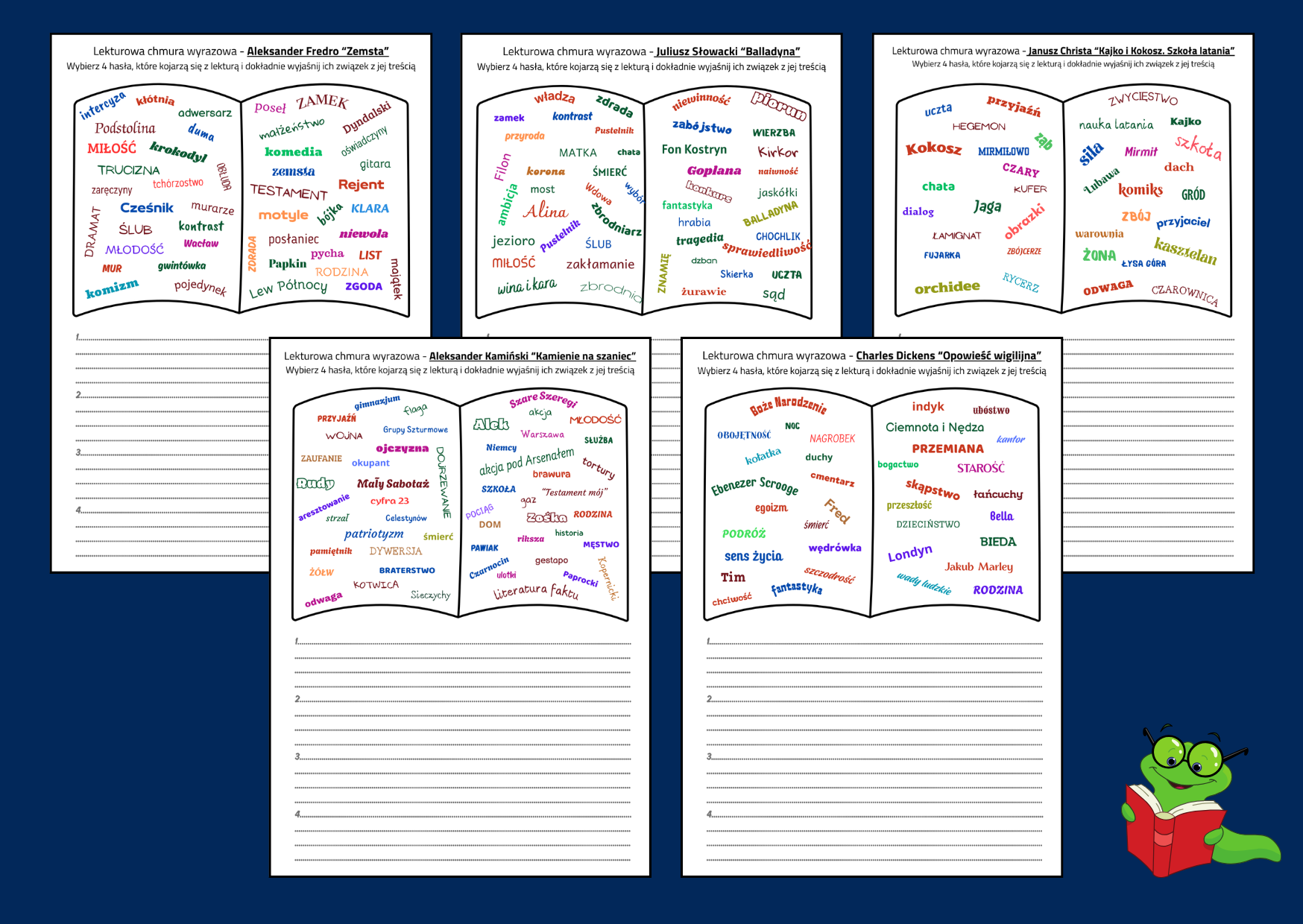 Materiał składa się 18 stron z chmurami wyrazowymi - skojarzeniami z lektur obowiązkowych z klas 4-8 oraz miejscem na uzasadnienie związku wyrazów z treścią lektury. 13 stron dotyczy lektur z klas 7-8 oraz 5 stron - lektury z kl. 4-6.