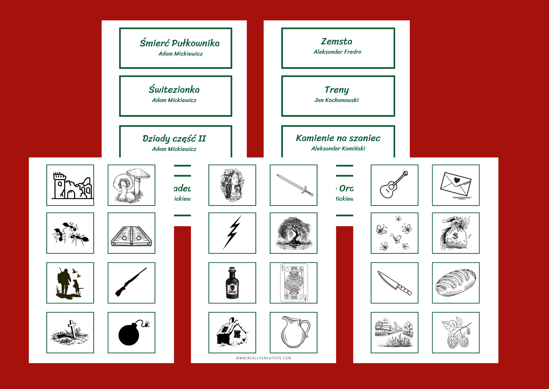 Zestaw 112 fiszek z ikonkami ( 14 stron fiszek z ikonkami + 5 stron fiszek z tytułami utworów), które można odnieść do lektur obowiązkowych z klas 7-8: