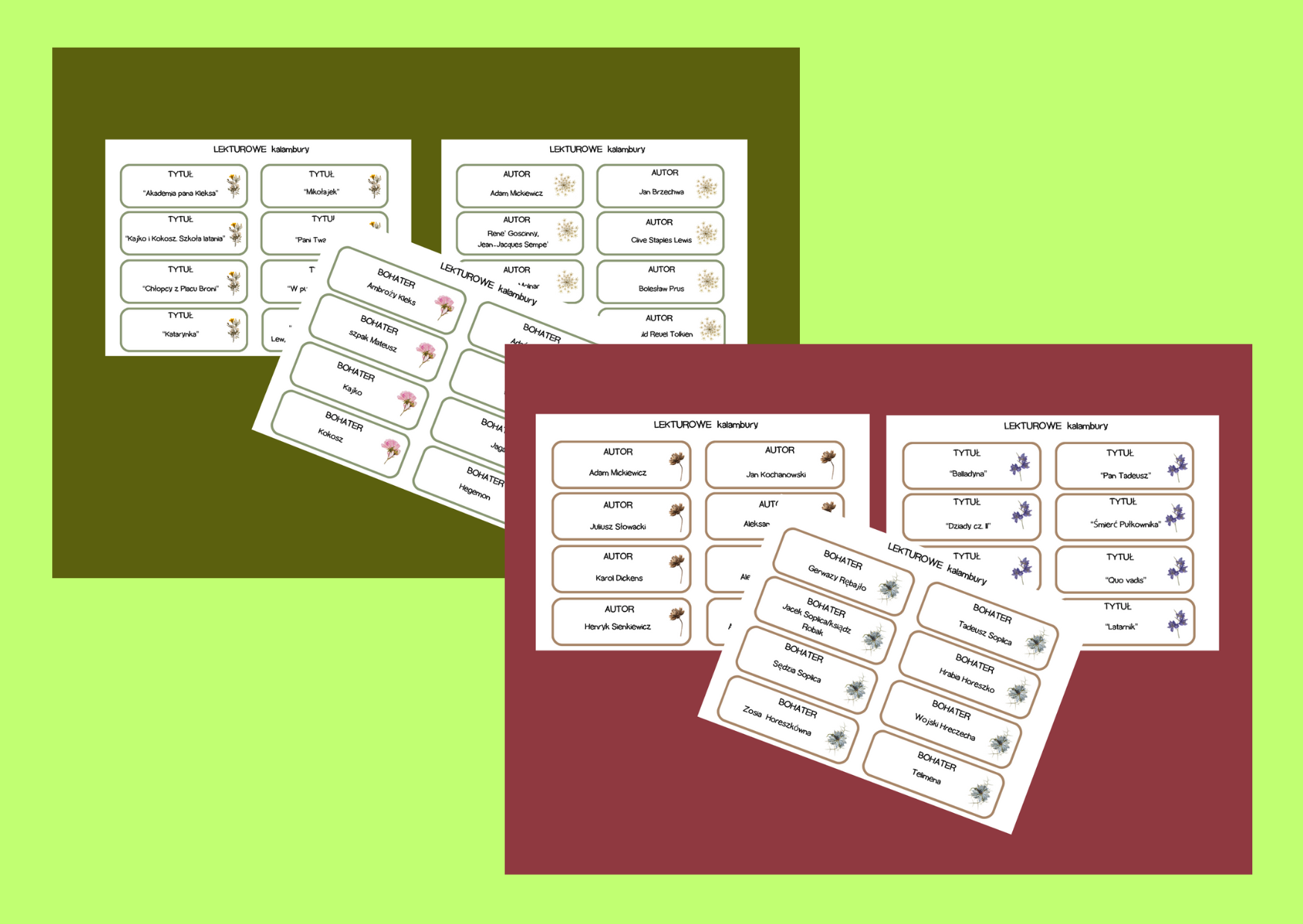 W zestawie znajdują się 24 karty (na każdej 8 fiszek) z hasłami związanymi z obowiązkowymi lekturami szkolnymi. Uczeń losuje fiszkę, a następnie przedstawia wylosowane hasło za pomocą gestów (kalambury ruchowe) lub rysunku (kalambury graficzne). Pozostali uczestnicy odgadują, o jaką postać, tytuł lub autora chodzi!