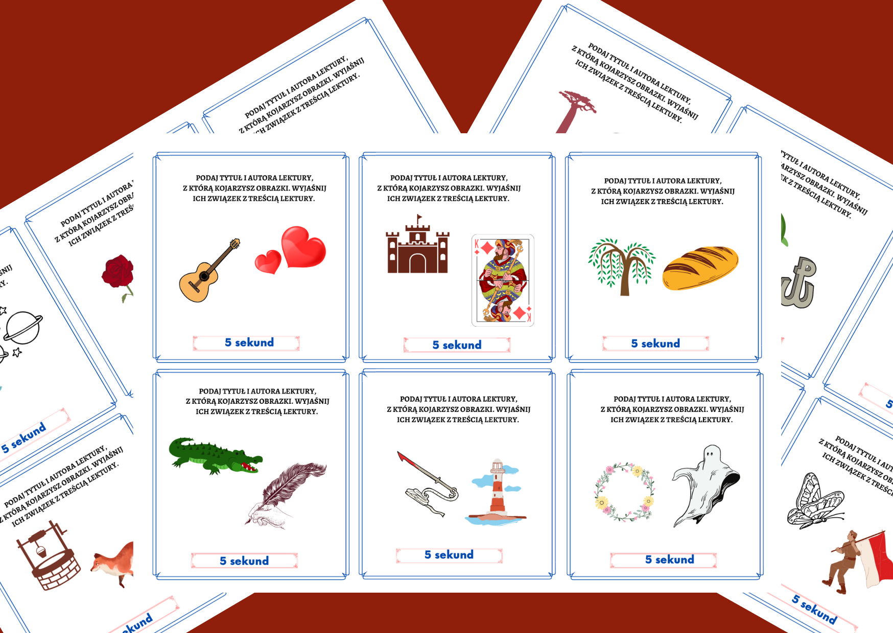 Zestaw 8 kart (format A4 pdf) z 48 karteczkami do gry „5 sekund”, zawierającymi po dwa obrazki kojarzące się lekturami obowiązkowymi z klas 7-8. Uczeń powinien wskazać tytuł i autora lektury oraz wyjaśnić związek ikonek z jej treścią. Ćwiczenie świetnie sprawdzi się na lekcjach powtórzeniowych.