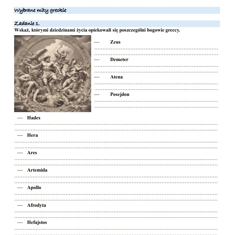 W każdej sekcji minimum 10 zadań, w tym: krzyżówki, prawda/fałsz, wnioskowanie, argumentowanie, charakterystyki bohaterów, ikonografia i inne.