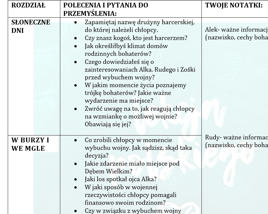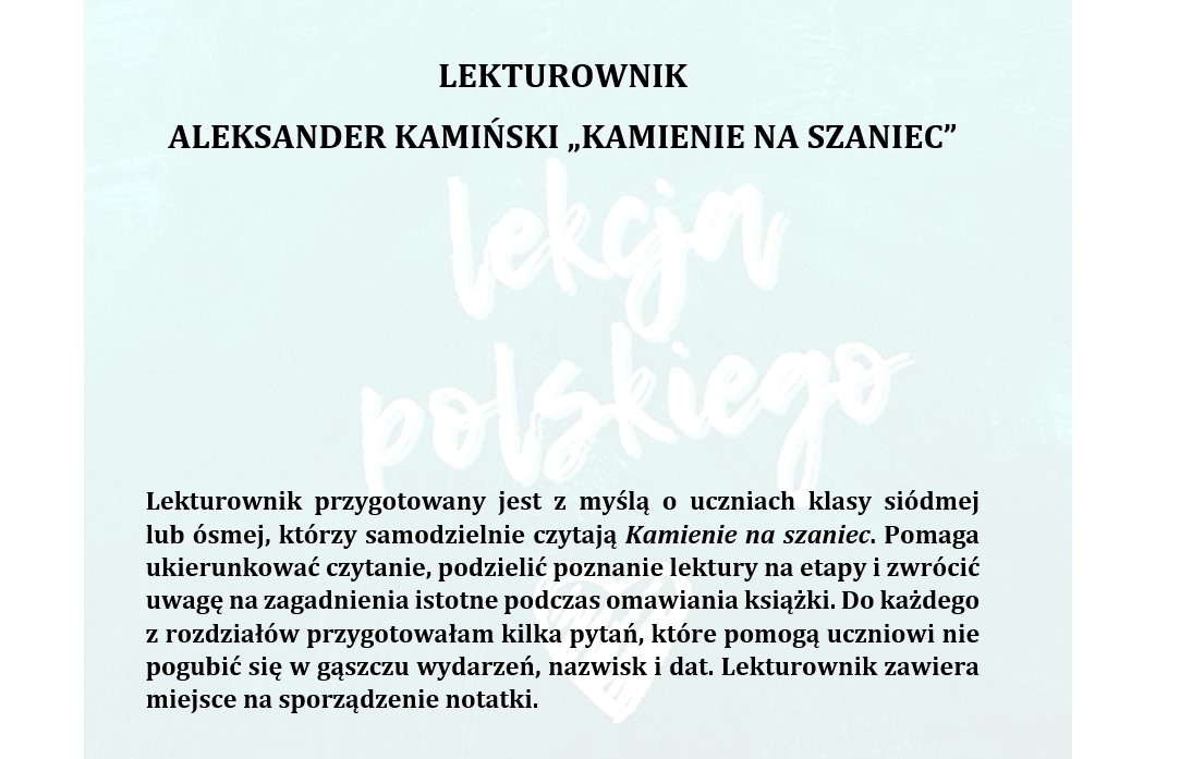 Lekturownik przygotowany jest z myślą o uczniach klasy siódmej lub ósmej, którzy samodzielnie czytają Kamienie na szaniec. Pomaga ukierunkować czytanie, podzielić poznanie lektury na etapy i zwrócić uwagę na zagadnienia istotne podczas omawiania książki. Do każdego z rozdziałów przygotowałam kilka pytań, które pomogą uczniowi nie pogubić się w gąszczu wydarzeń, nazwisk i dat. Lekturownik zawiera miejsce na sporządzenie notatki.