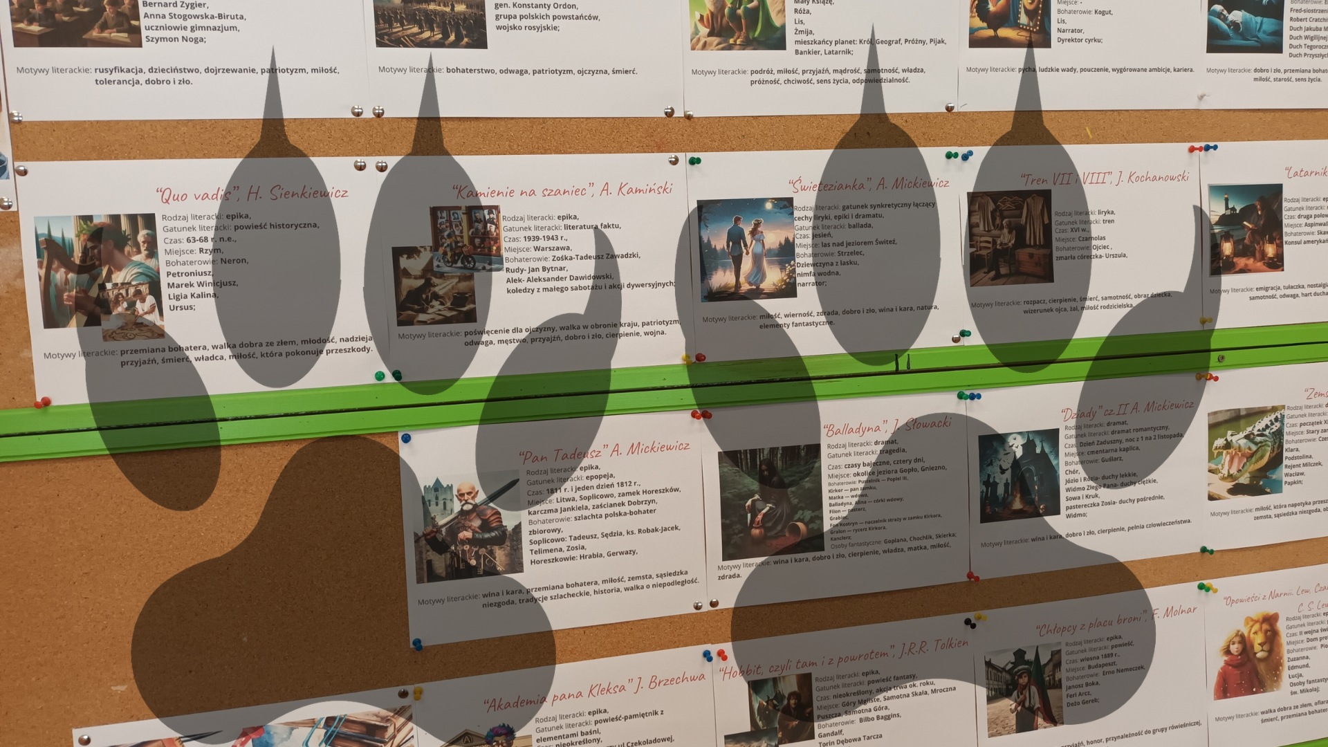 Zestaw zawiera 20 kartek A4 do wydruku, na których znajdują się informacje odnośnie rodzaju i gatunku literackiego, elementy świata przedstawionego oraz motywy literackie. Całość uzupełniają piękne grafiki wygenerowane przez Al, które mogą być bazą do pracy z ikonografiką. Ponad to zestaw może stanowić gazetkę- ściągę dla ósmoklasistów, materiał do powtórzeń czy łączenia lektur o podobnej tematyce. Na dwóch stronach znajdują się adekwatne do całości napisy w tym informacja CKE o lekturach IV-VI w najbliższych dwóch latach.