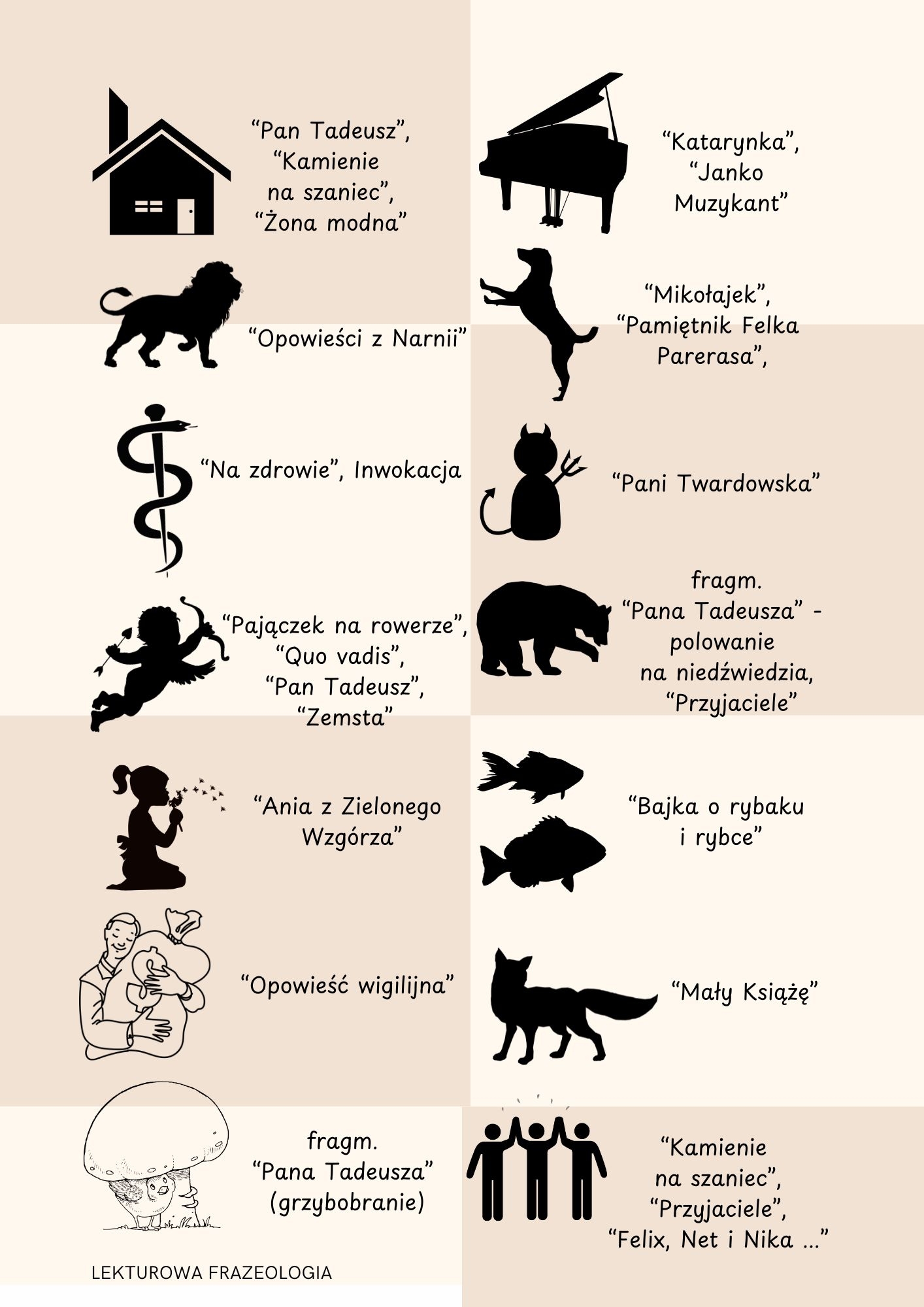 Materiał zawiera karty pracy (14) wraz z propozycjami rozwiązań. Do każdej karty dołączony jest link do prezentacji (canva) kompatybilnej z kartą oraz do ćwiczenia interaktywnego sprawdzającego stopień zrozumienia znaczenia frazeologizmu.