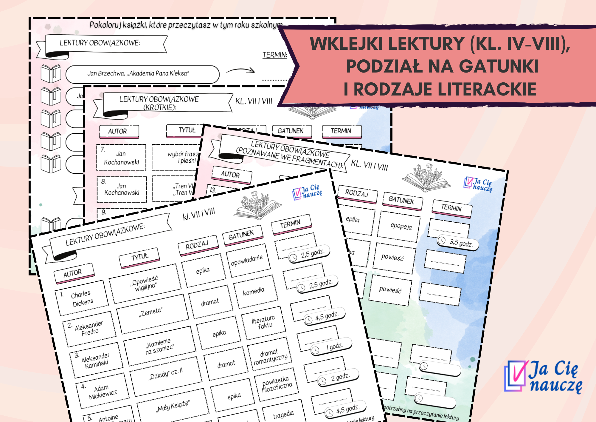 Zestaw uniwersalnych wklejek z wykazem lektur dla klas IV-VI (uczniowie kolorują wybrane w danym roku szkolnym tytuły, wpisują lekturę uzupełniającą) oraz VII-VIII.