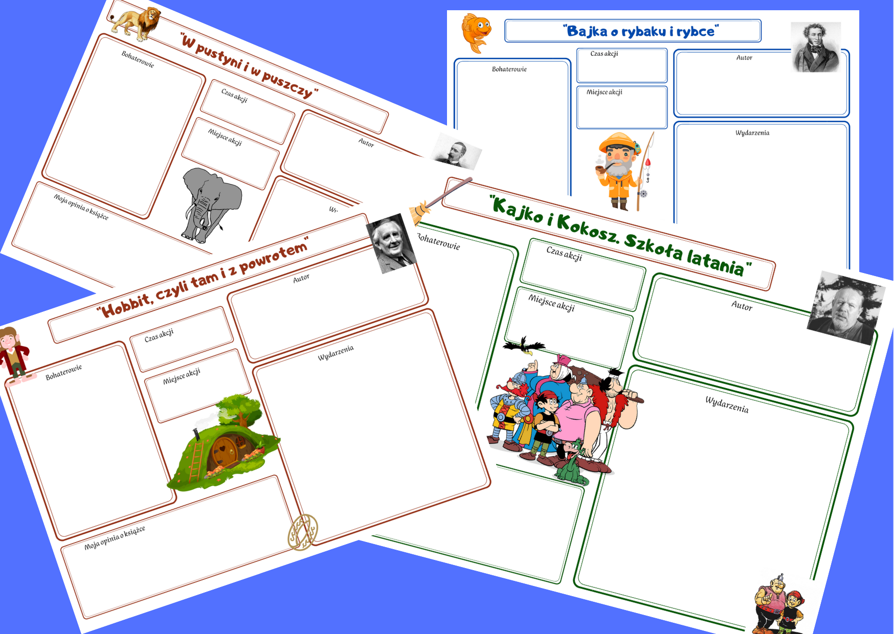 Zestaw zawiera 14 kart pracy dotyczących świata przedstawionego lektur z klas 4-6: "Akademia Pana Kleksa", "Kajko i Kokosz. Szkoła latania", "Mikołajek", "Opowieści z Narnii. Lew, czarownica i stara szafa", "Powrót taty", "Pani Twardowska", "Chłopcy z Placu Broni", "Katarynka", "W pustyni i w puszczy", "Hobbit, czyli tam i z powrotem", "Kopciuszek", "Bajka o rybaku i rybce", "Pinokio", "Ania z Zielonego Wzgórza".